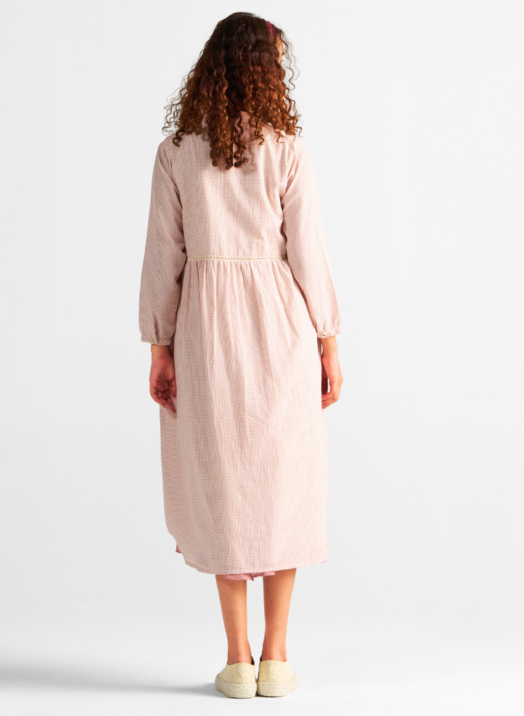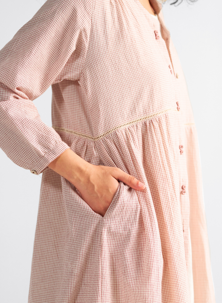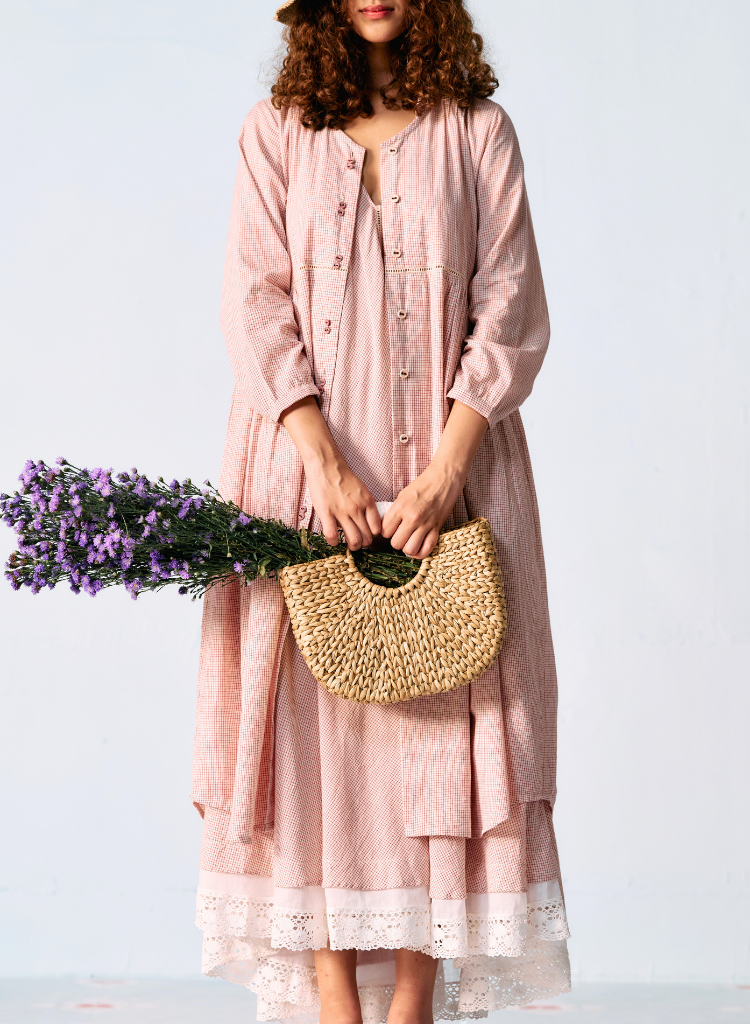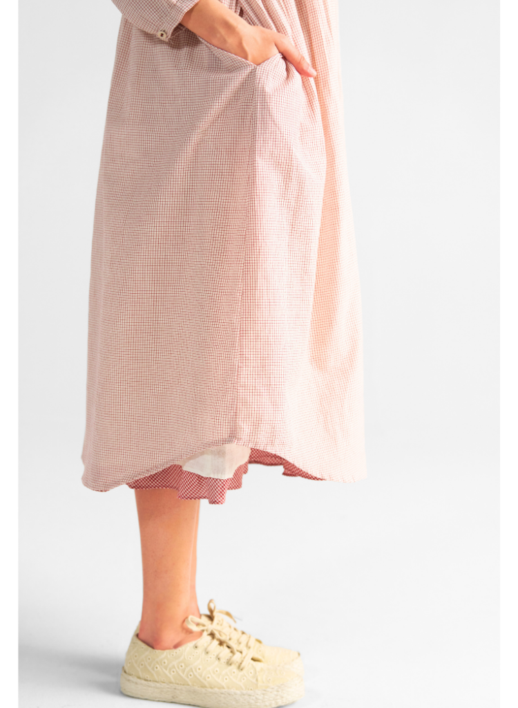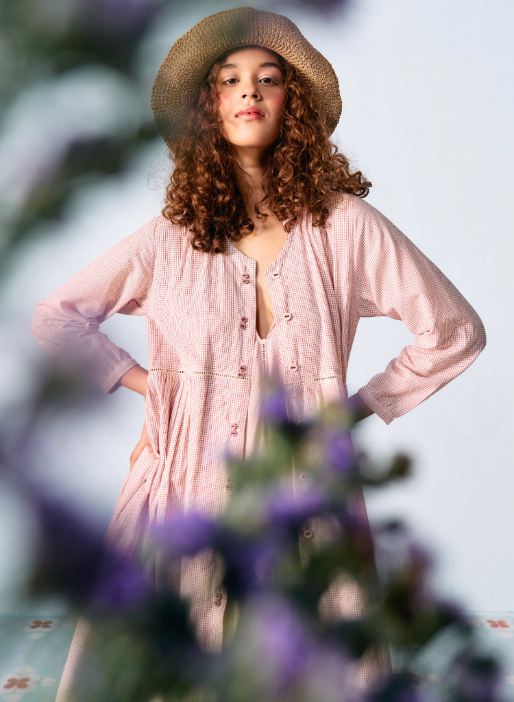 A relaxed fitting jacket with soft gathers and playful handwoven checks featuring a pleated neck, a front button placket and inseam pockets. Length 45". The model is 5'6" and is wearing a size S.