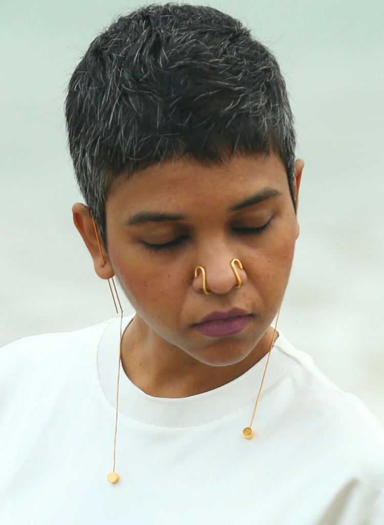 A pair of earrings featuring a long, enchanting earring with two parallel lines - one adorned with a delicate chain and a captivating circular disk, while the other gracefully passes through your earring hole, aligning seamlessly with the chain.
