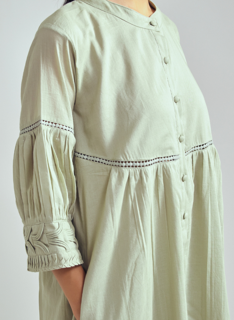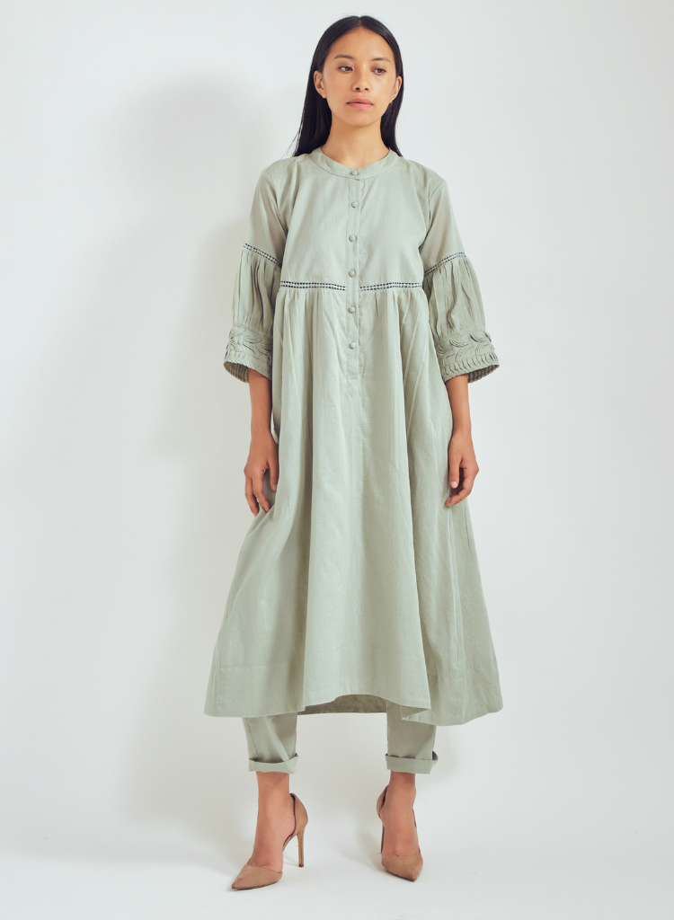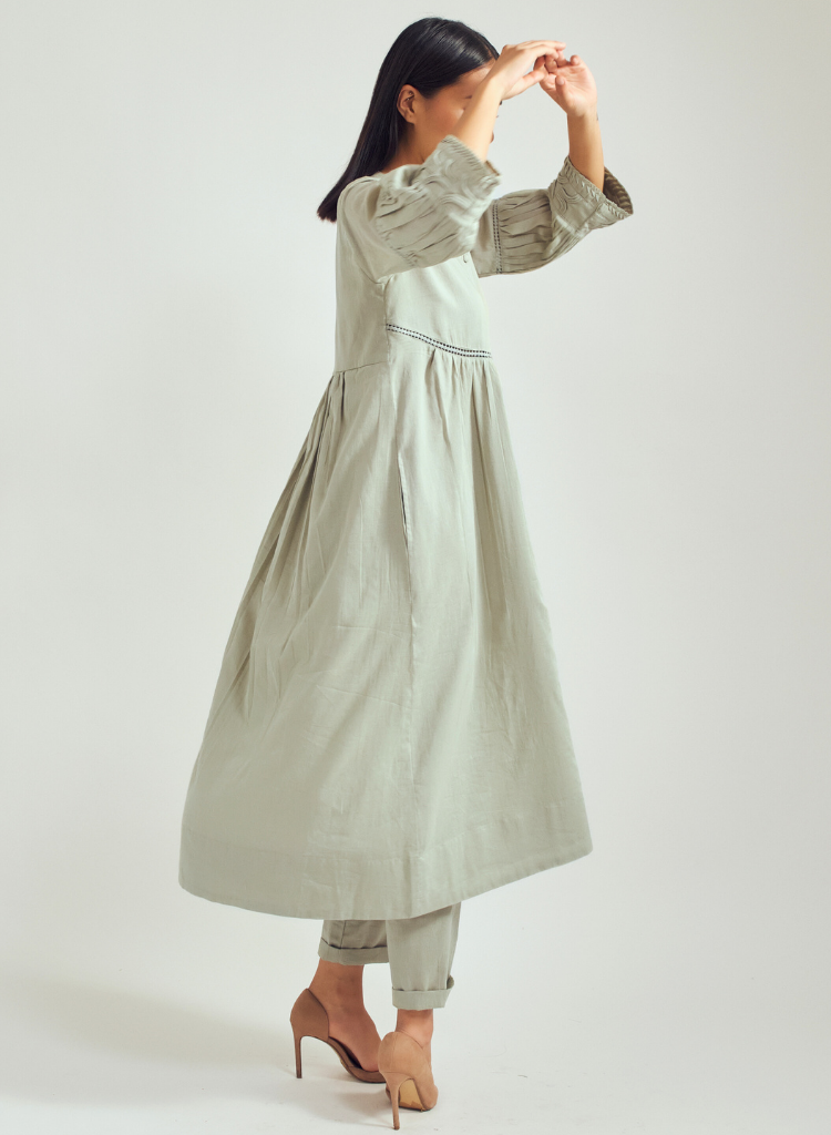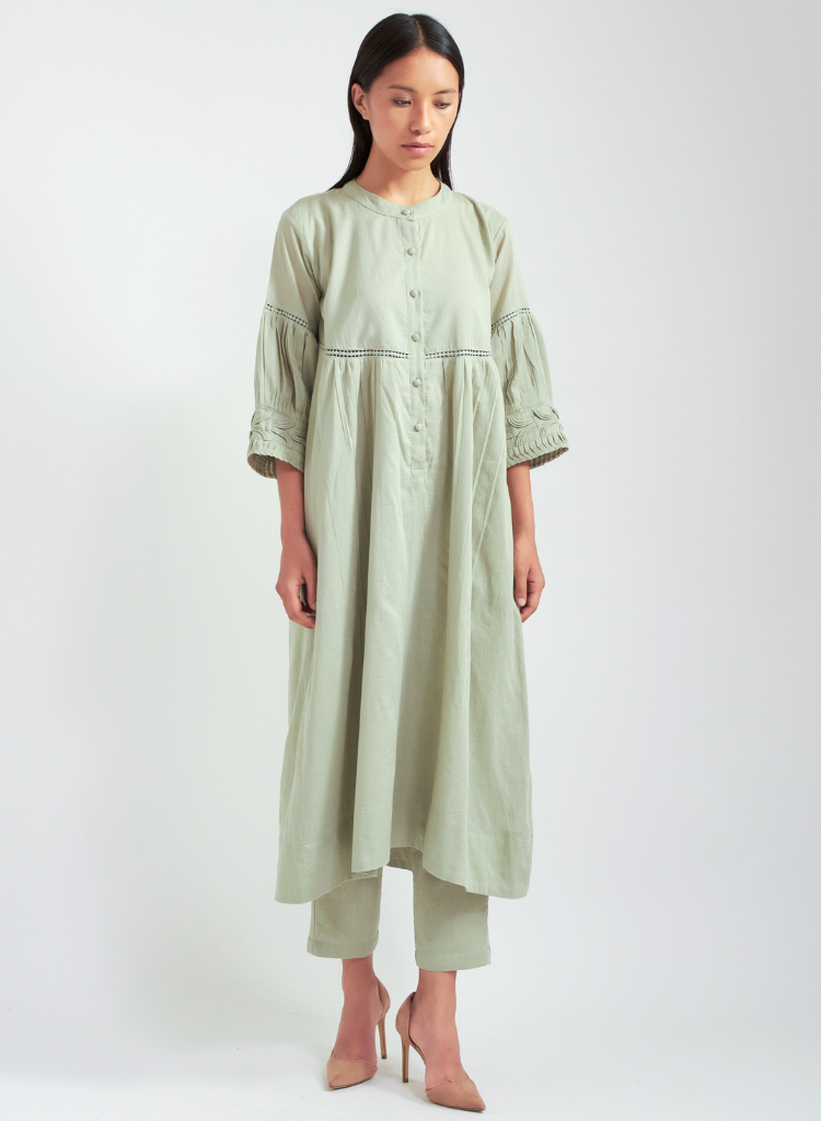 A two-piece set pairing a relaxed fitting kurta and pencil pants. The relaxed fitting kurta features a round neck, a half button placket and inseam pockets. Length 46". The straight-fitting pencil pants feature a fitted waist and inseam pockets. Length 36". The model is 5'6" and is wearing size XS.