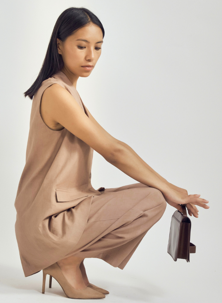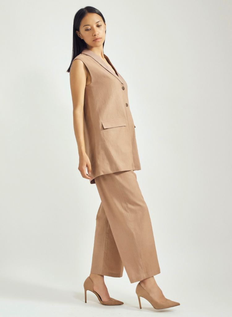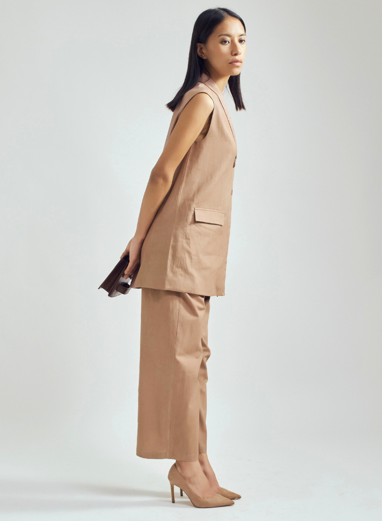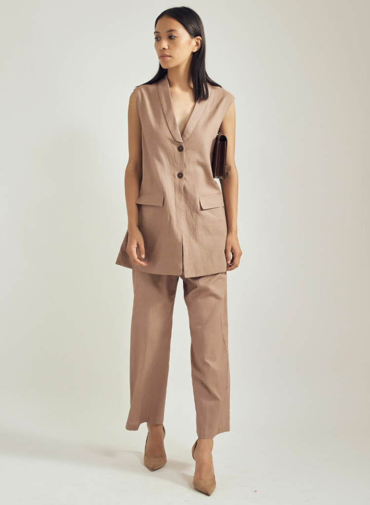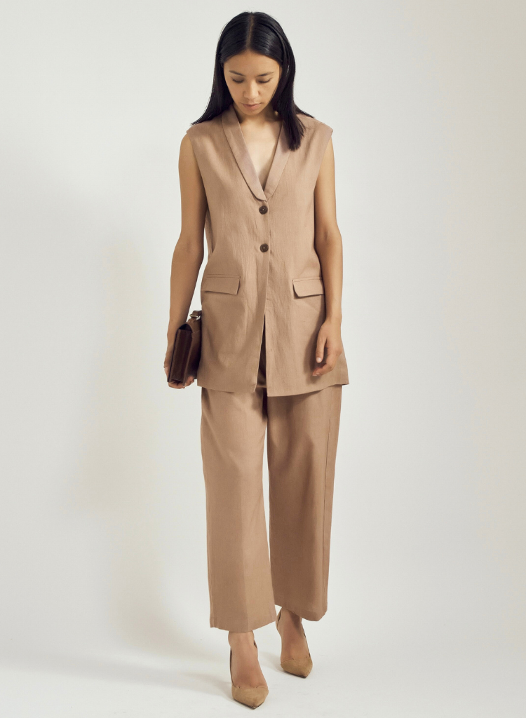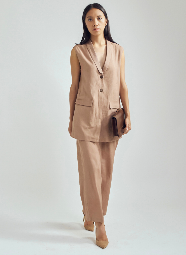 A two-piece set pairing a sleeveless vest and matching pants. The sleeveless vest features a lapel collar, welt pockets and a front button closure. Length 30". The matching pants feature an elasticated waist and inseam pockets. Length 35". The model is 5'6" and is wearing size XS.
