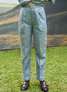 A pair of straight cut pants with a stitched front crease detail featuring a fitted waist and inseam pockets. Length 39.5". The model is 5'6" and is wearing a size S.