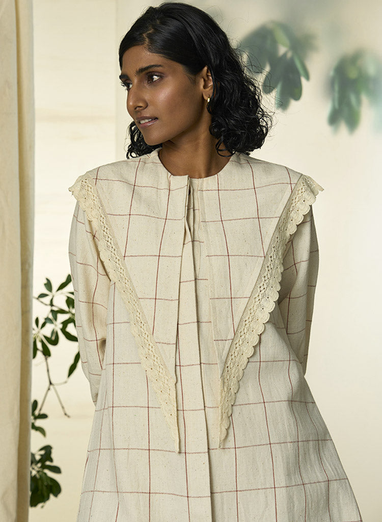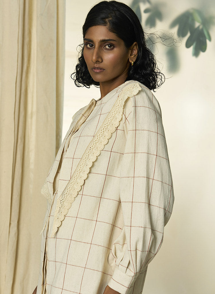 A front open mini dress with an exaggerated yoke adorned with delicate lace details. Features cuffed sleeves with slight gather details and a lace edging at the hem. Length 33". The model is 5'6" and is wearing a size S.