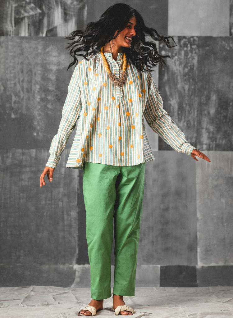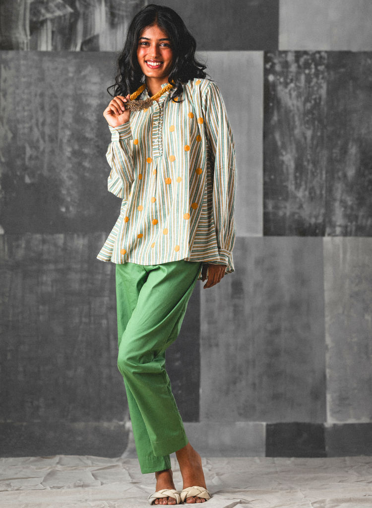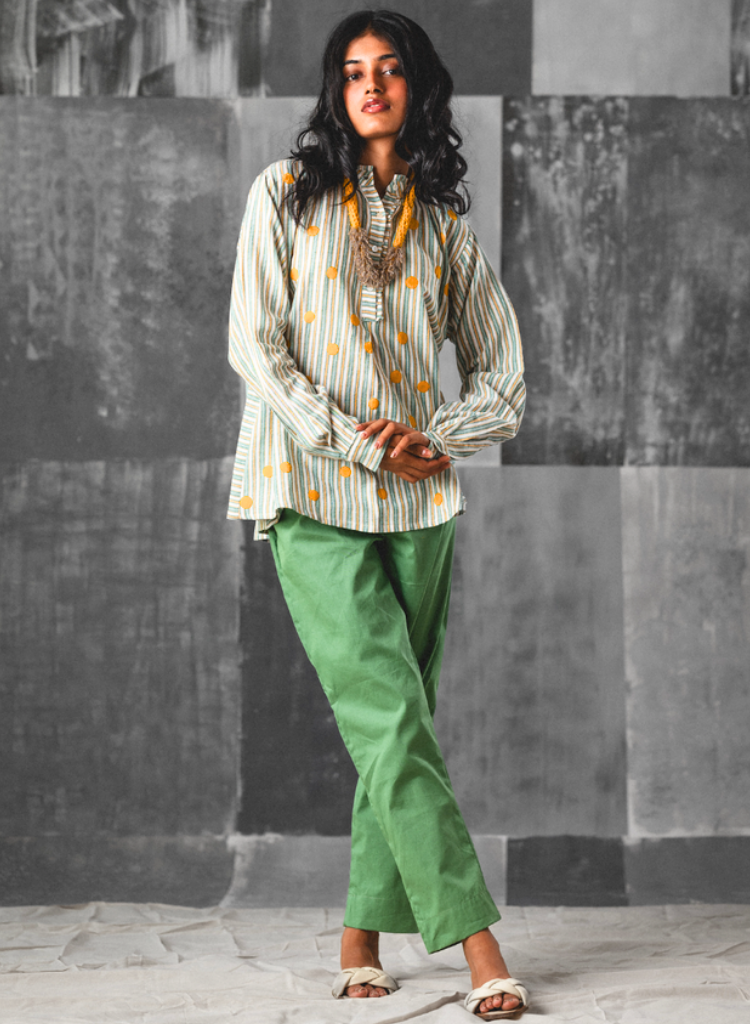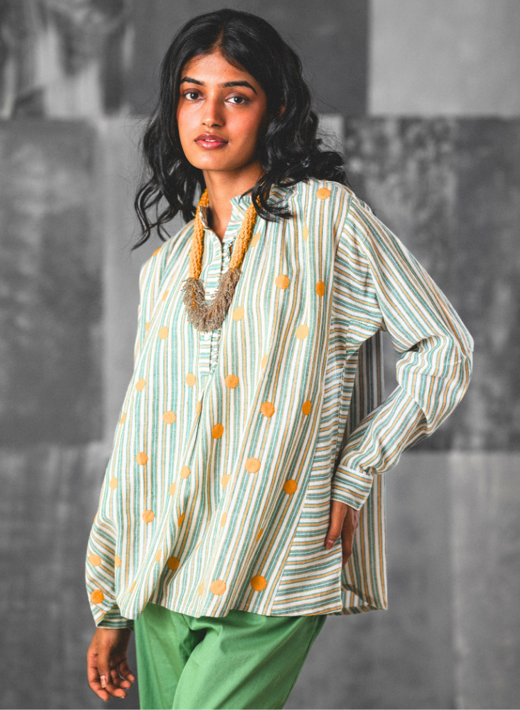 A stripe-printed top with applique polka dots, a half button-down placket, and side panels. Features a stand collar and long cuffed sleeves. Length 27". The model is 5'5" and is wearing size S.