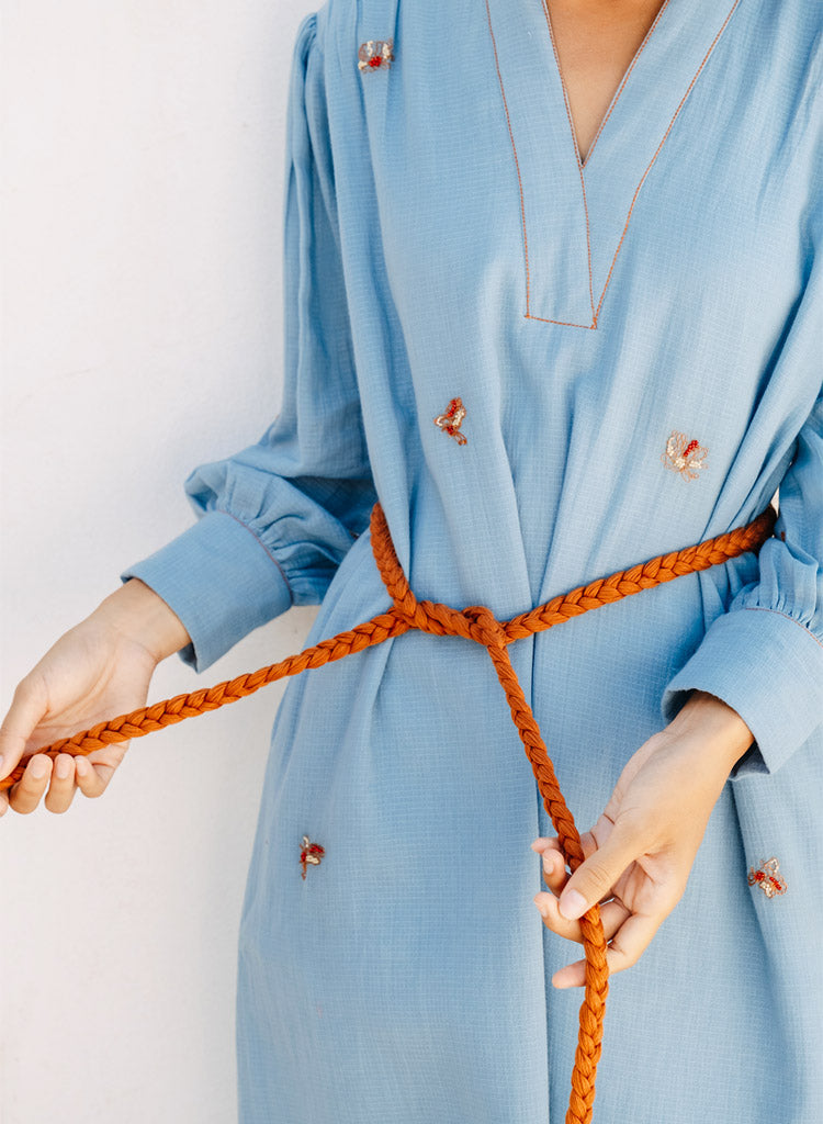 A hi-low straight fit dress with all over hand embriodered motifs and stitching detailing on the seam lines. Features gathered detailing on the shoulder and sleeves and inseam pockets. Front length 46", Back length 48". The model is 5'8", and is wearing size S.