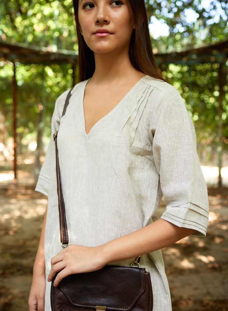 A straight fitting mini dress with pleat details featuring a V-neck and inseam pockets. Length 35". The model is 5'7" and is wearing size XS.