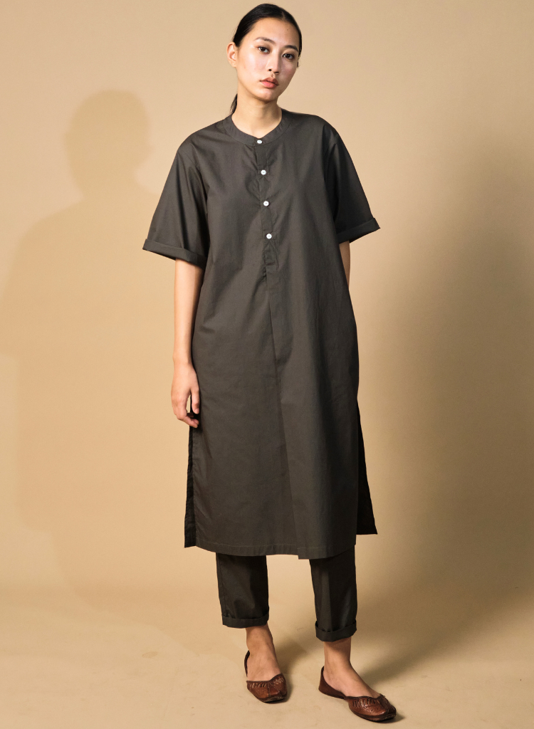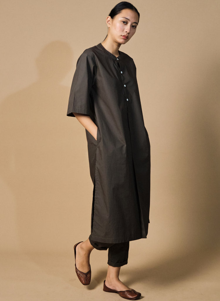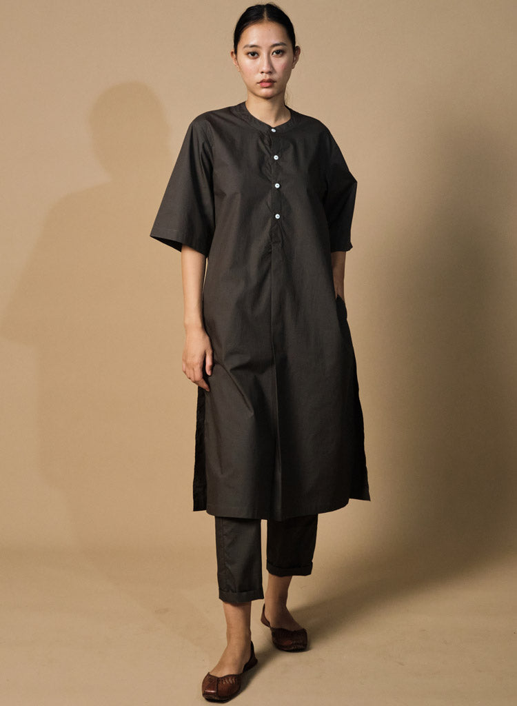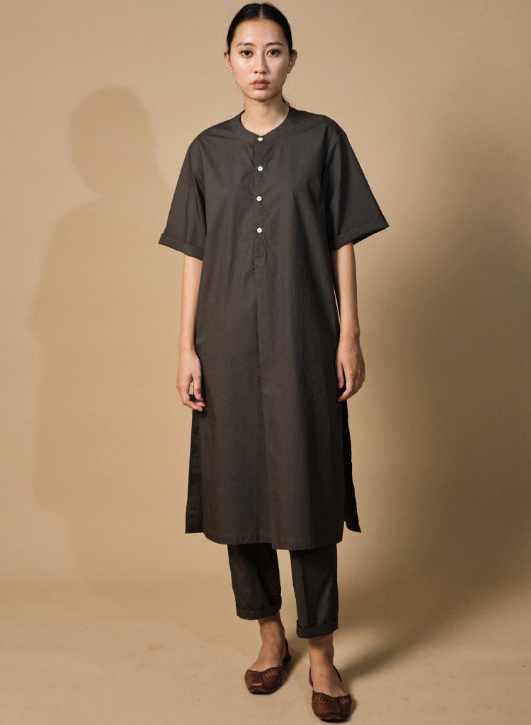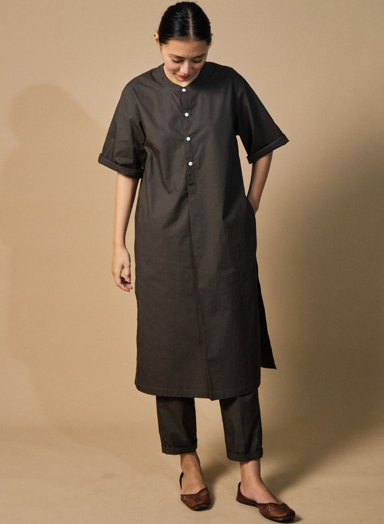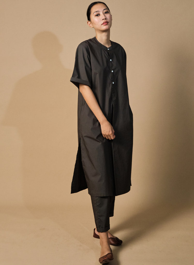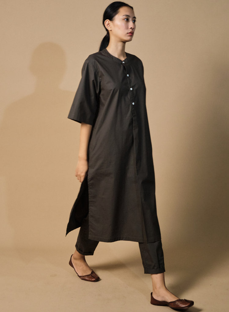 A two-piece set pairing a straight kurta and pencil pants. The straight-fitting kurta features a half placket, a band collar, side slits and inseam pockets. Length 44". The straight-fitting pencil pants feature a fitted waist and inseam pockets. Length 36". The model is 5'7" and is wearing size XS.