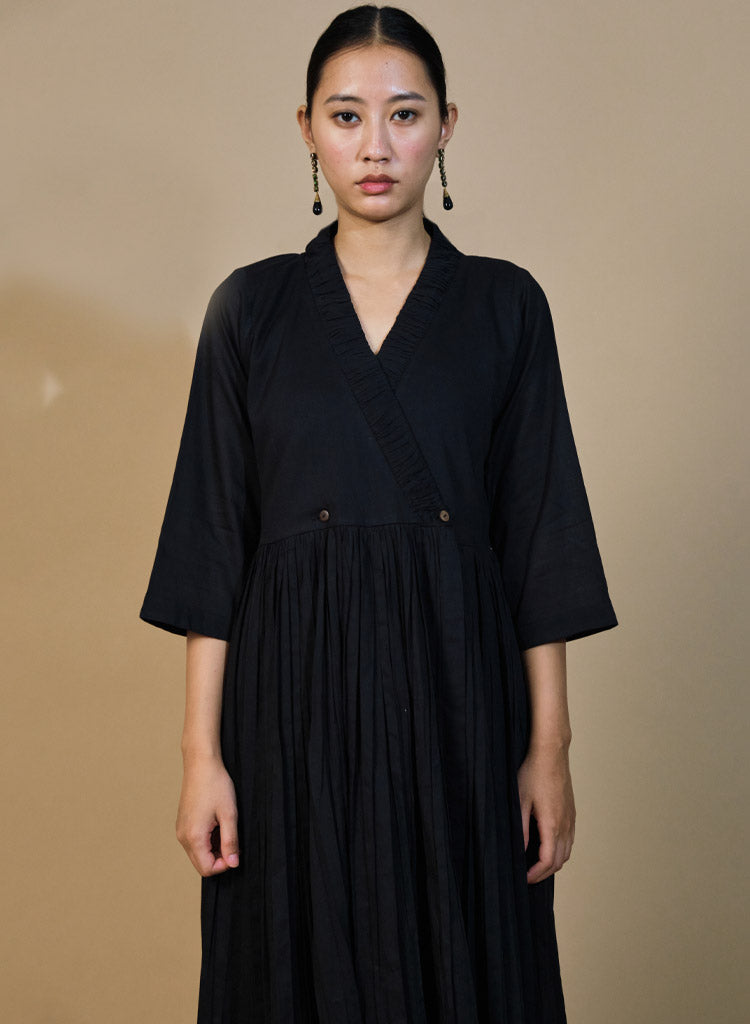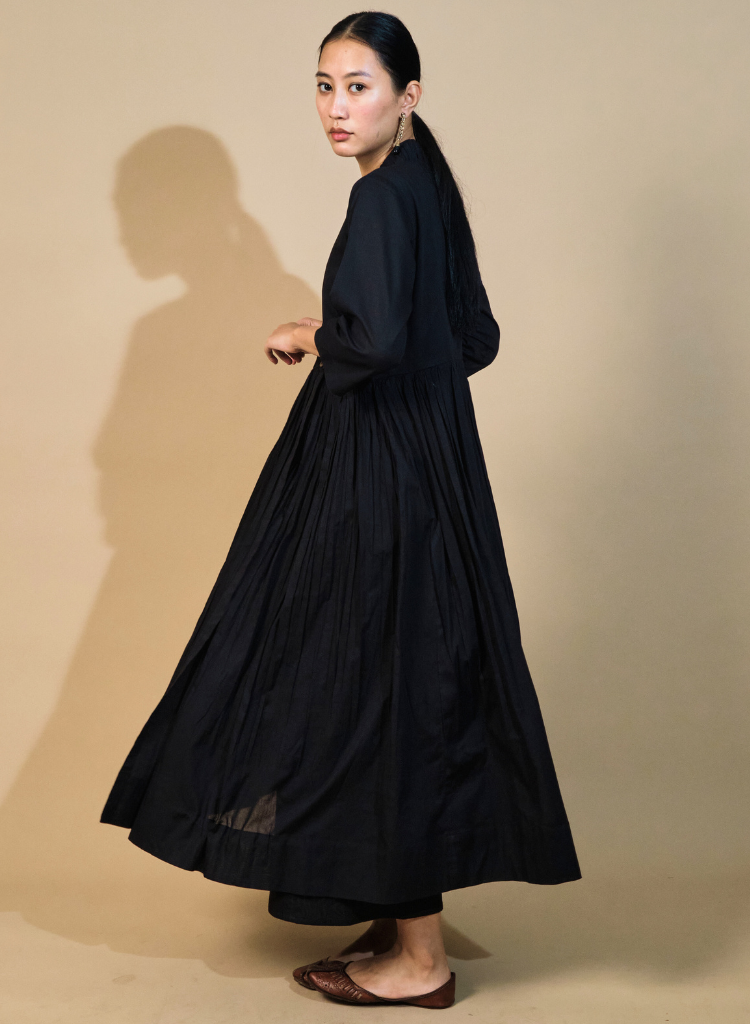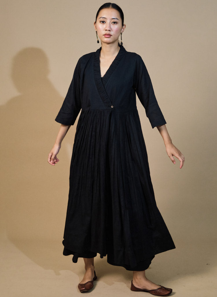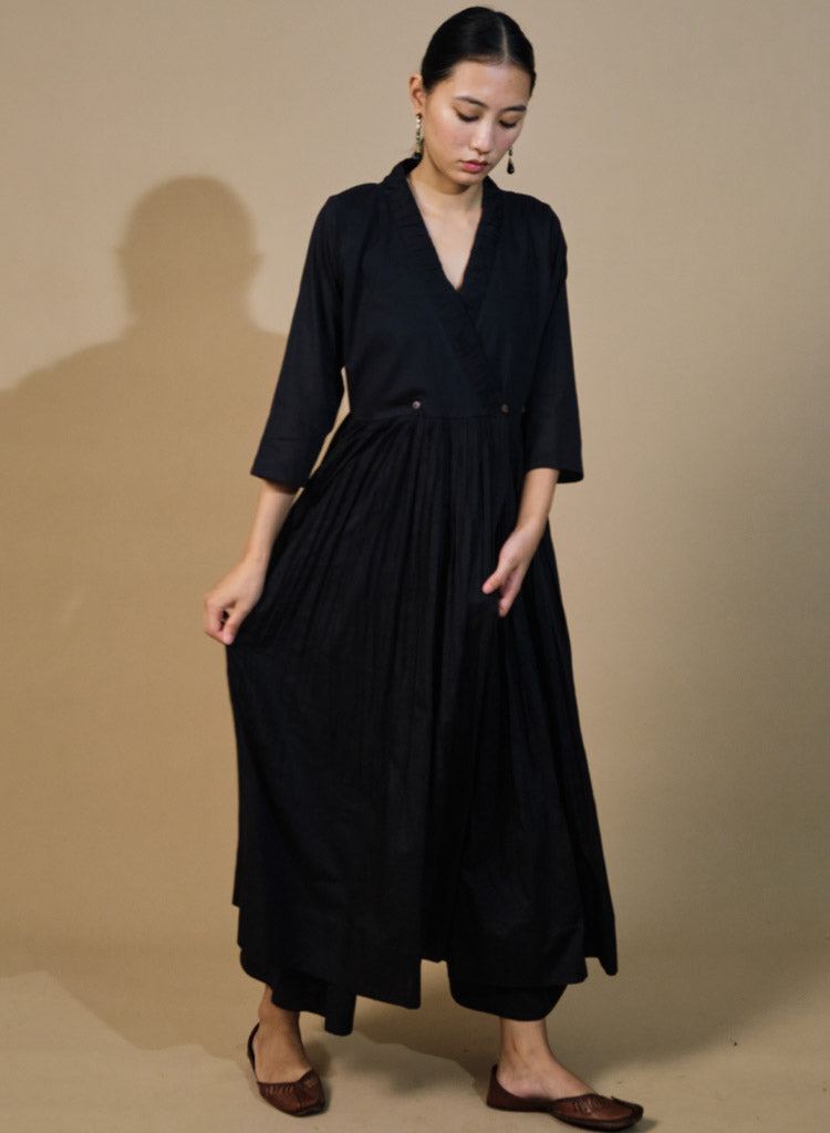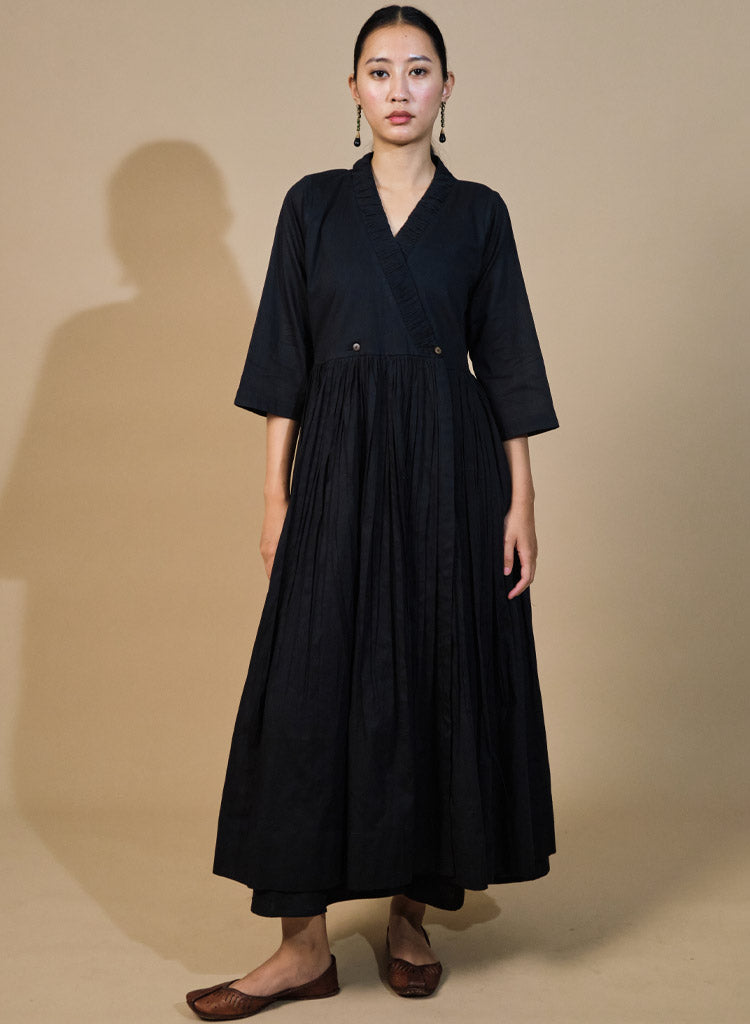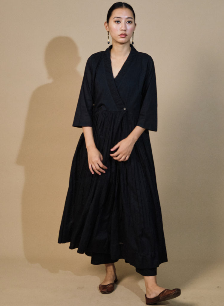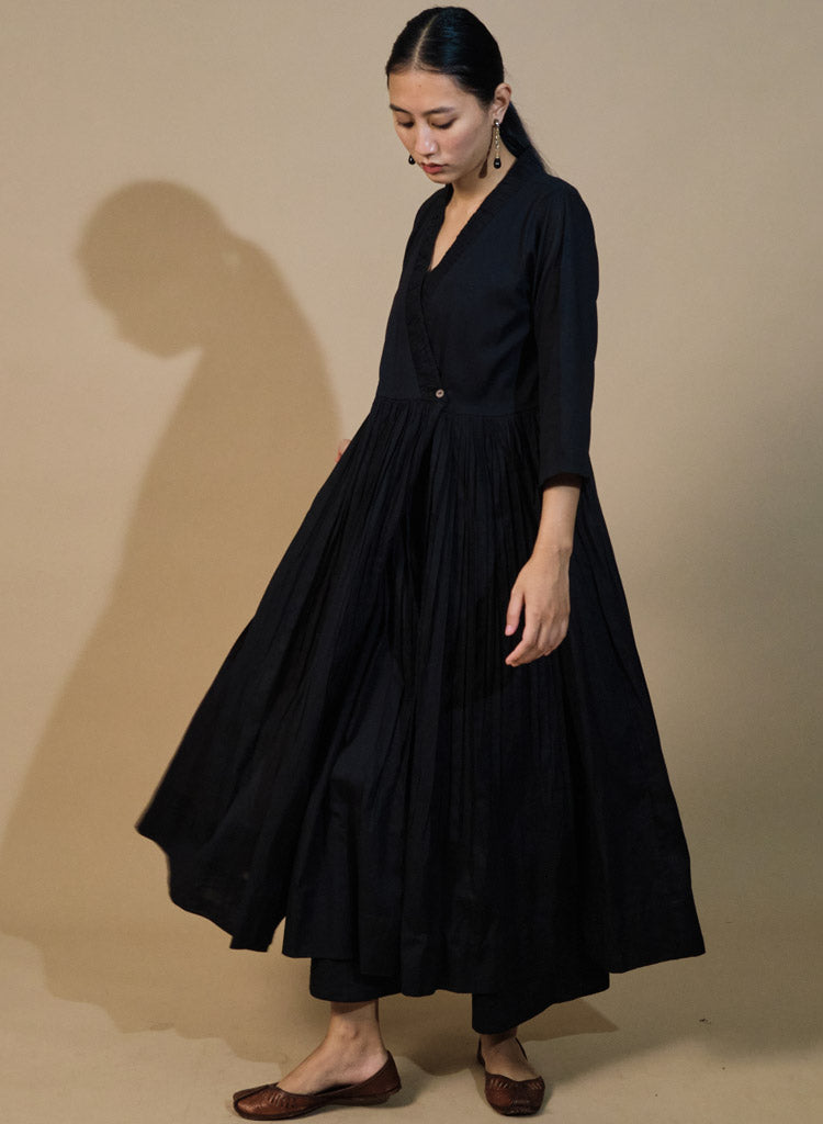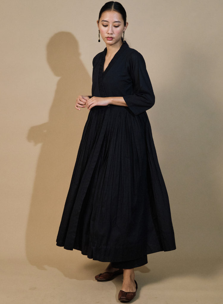 A two-piece set pairing a relaxed fitting Anarkali and flared pants. The relaxed fitting Anarkali with pleat details features a V-neck and inseam pockets. Length 49". The flared pants feature a fitted waist and inseam pockets. Length 35". The model is 5'7" and is wearing size XS.