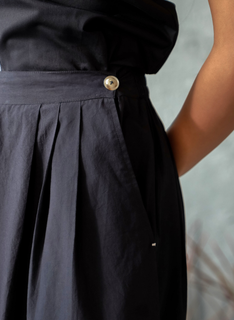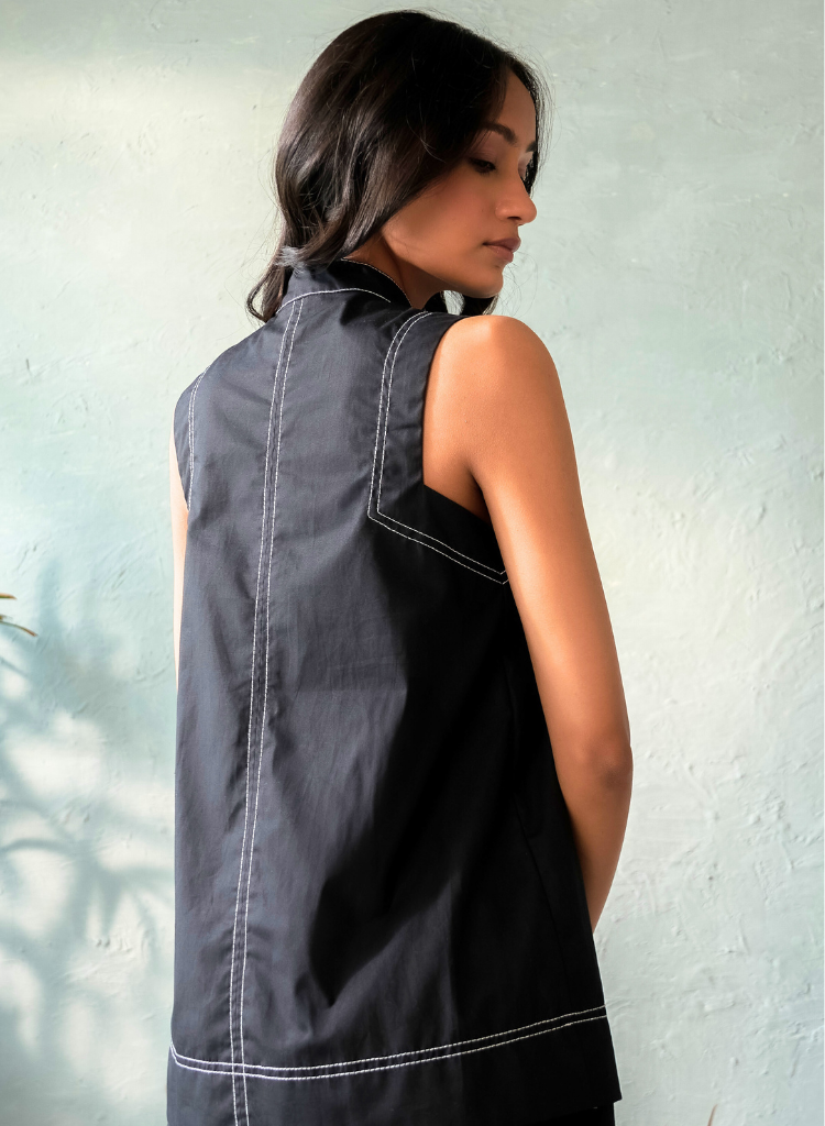 A two piece set pairing the Black Sesame Top and the Black Sesame Pants. The chic top with intricate stitch detailing features a band collar with a button closure. Length 27". The sleek tailored pants with stitch detailing feature a pleat design and a half-elasticated waistband at the back. Length 36". The model is 5'10" and is wearing size S.
