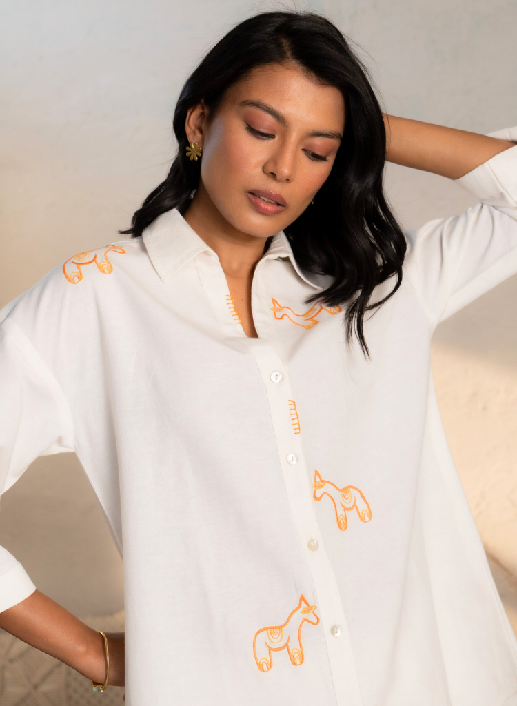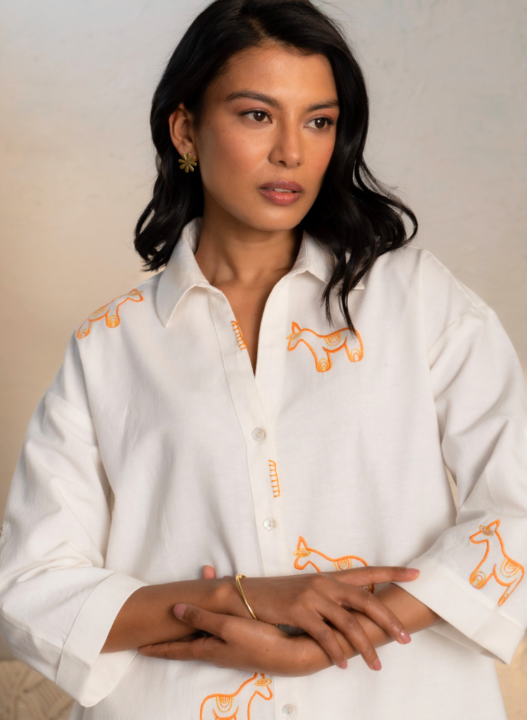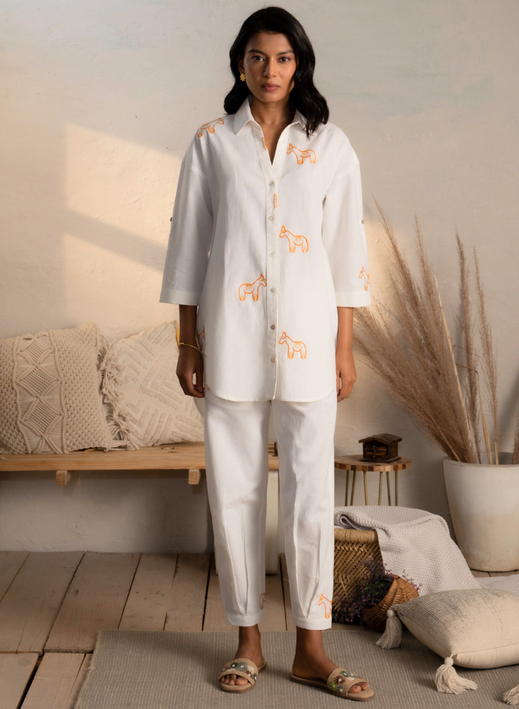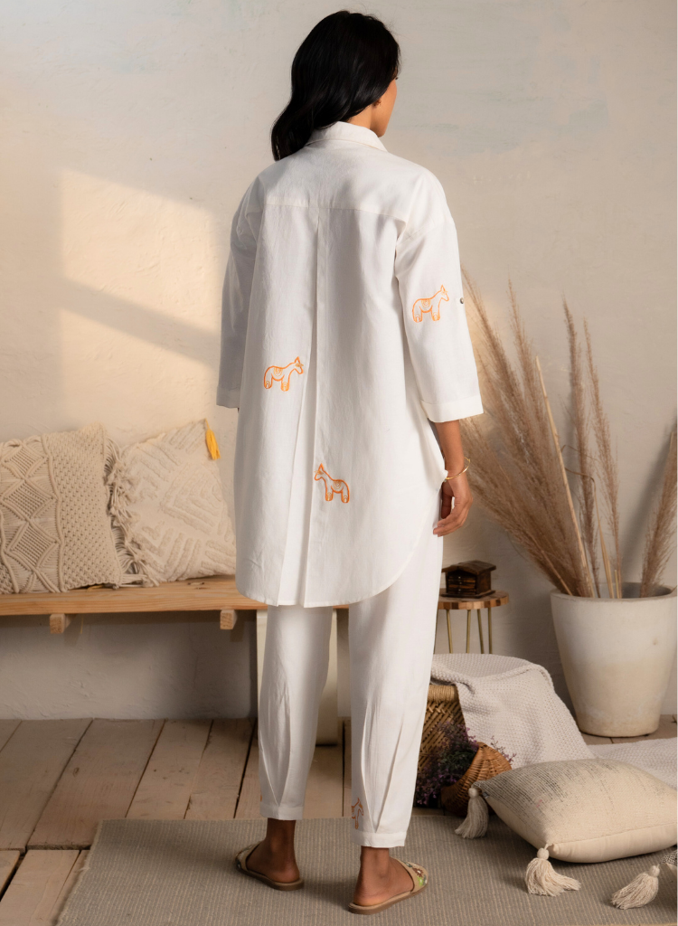 A two-piece set pairing the an embroidered shirt and matching pants. The classic fit shirt with an asymmetric hem features a collared V neck, side slits and a front button placket. Front length 28.5", Back length 33". The matching pants with tapered legs feature an elasticated drawstring waist. Length 35". The model is 5'9" and is wearing size S.