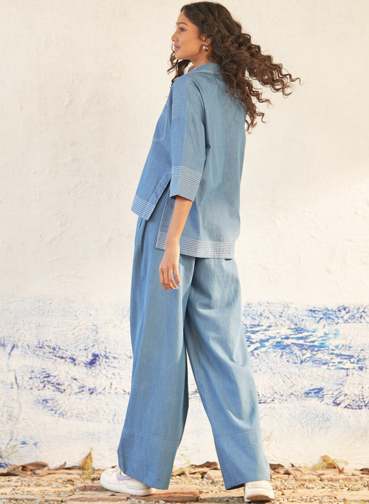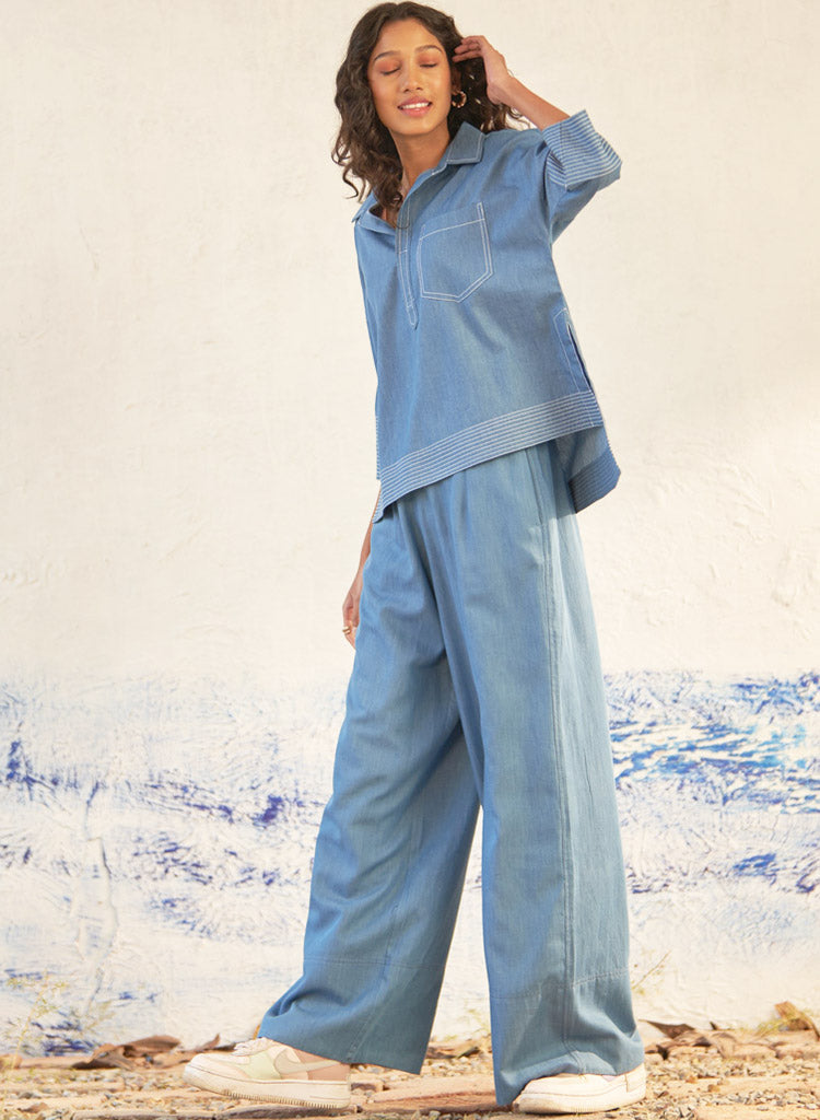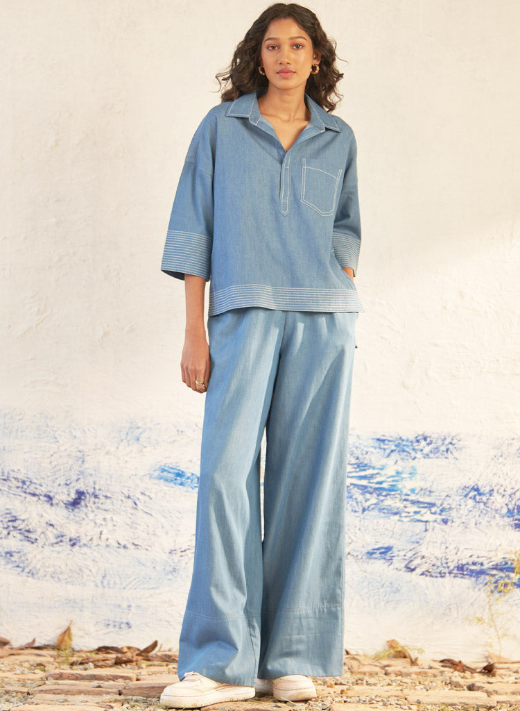 A two piece set pairing a relaxed fitting top and matching pants. The elbow-sleeved top features a collared neckline with a deep V-neck and a patch pocket detailed with white stitching. Length 23". The matching pants feature wide legs with stylish broad folds at the bottom and an elasticated waistband. Length 40". The model is 5'9" and is wearing size S.