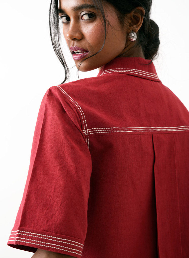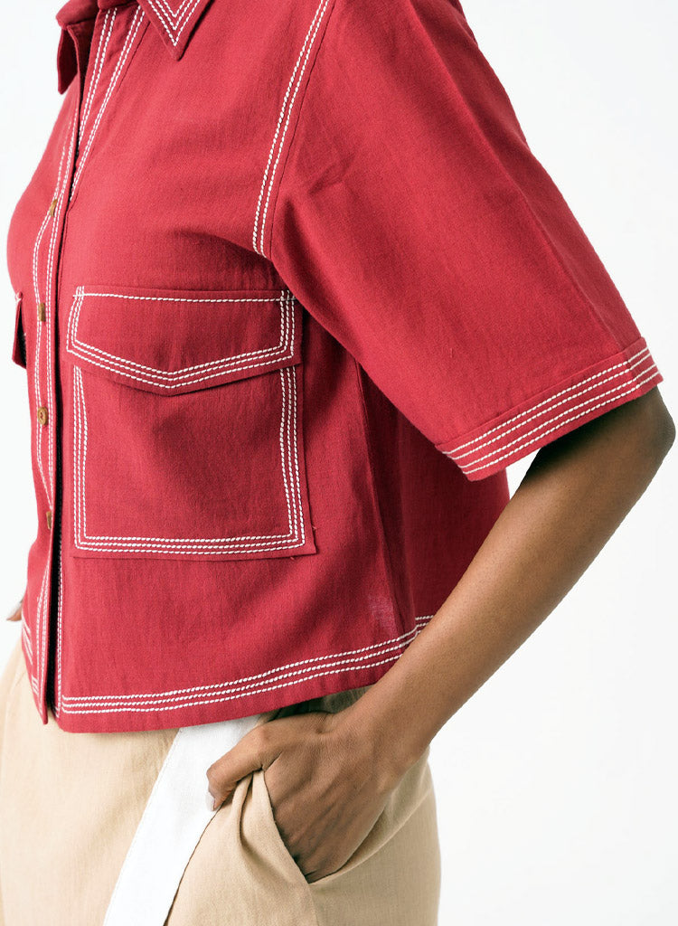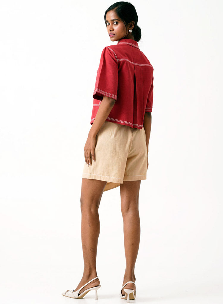 A two piece set pairing a cropped shirt and a skort. The cropped shirt with stitch details and a back pleat features patch pockets. Length 20". The skort with a flat front features a flap and button, an elasticated back and inseam pockets. Length 15". The model is 5'10" and is wearing a size S.