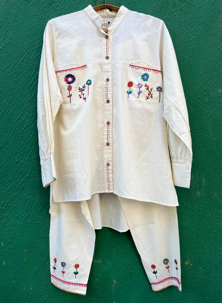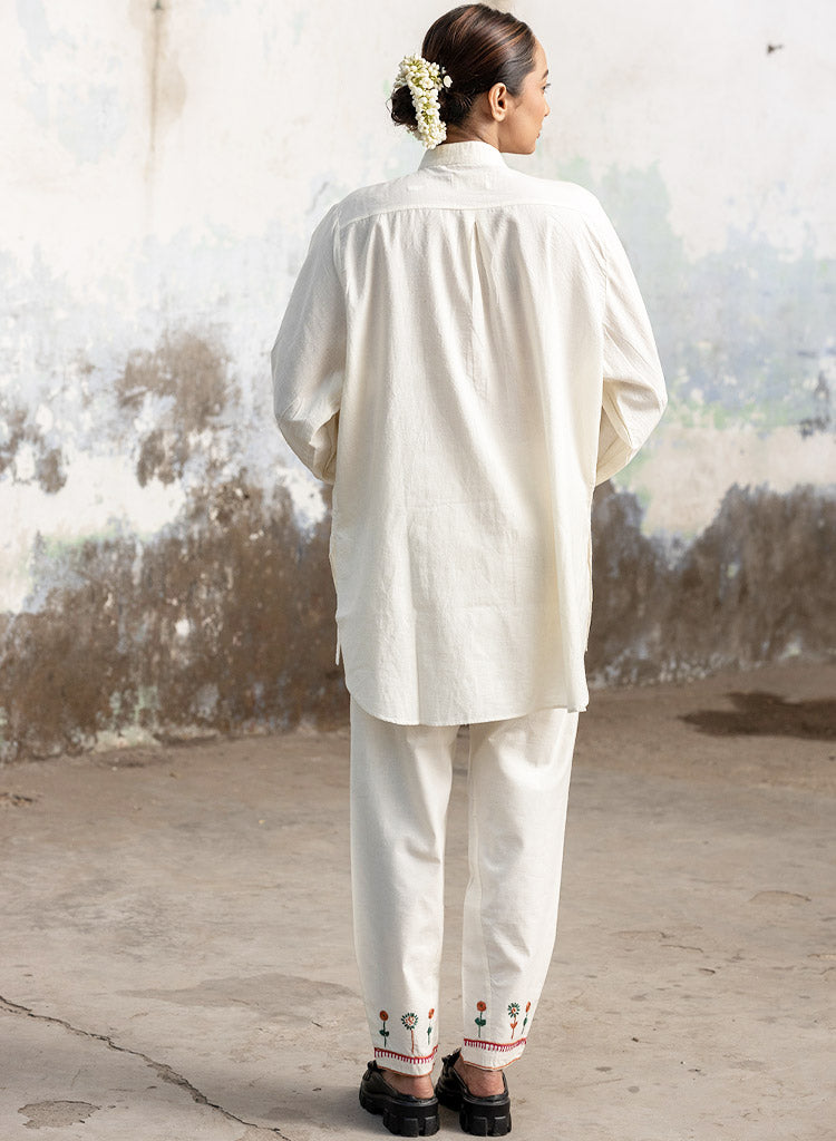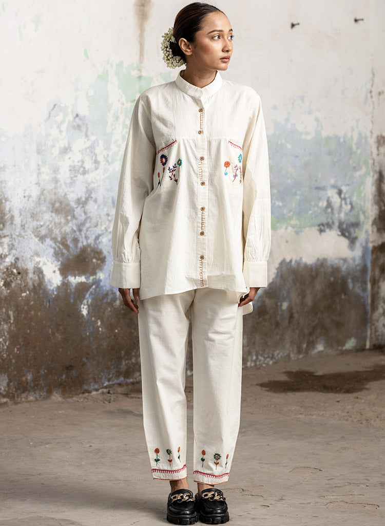 A two-piece set pairing the Bloom Shirt and the Bloom Pants. The relaxed-fitting shirt with intricate embroidery details on the two front chest pockets and button-down centre front placket features a stand collar and long cuffed sleeves with gathered hem. Length 27". Made in handwoven cotton. The relaxed-fitting pants with straight-cut pattern feature embroidery details on the hem. Length 36". The model is 5'4" and is wearing a size M.