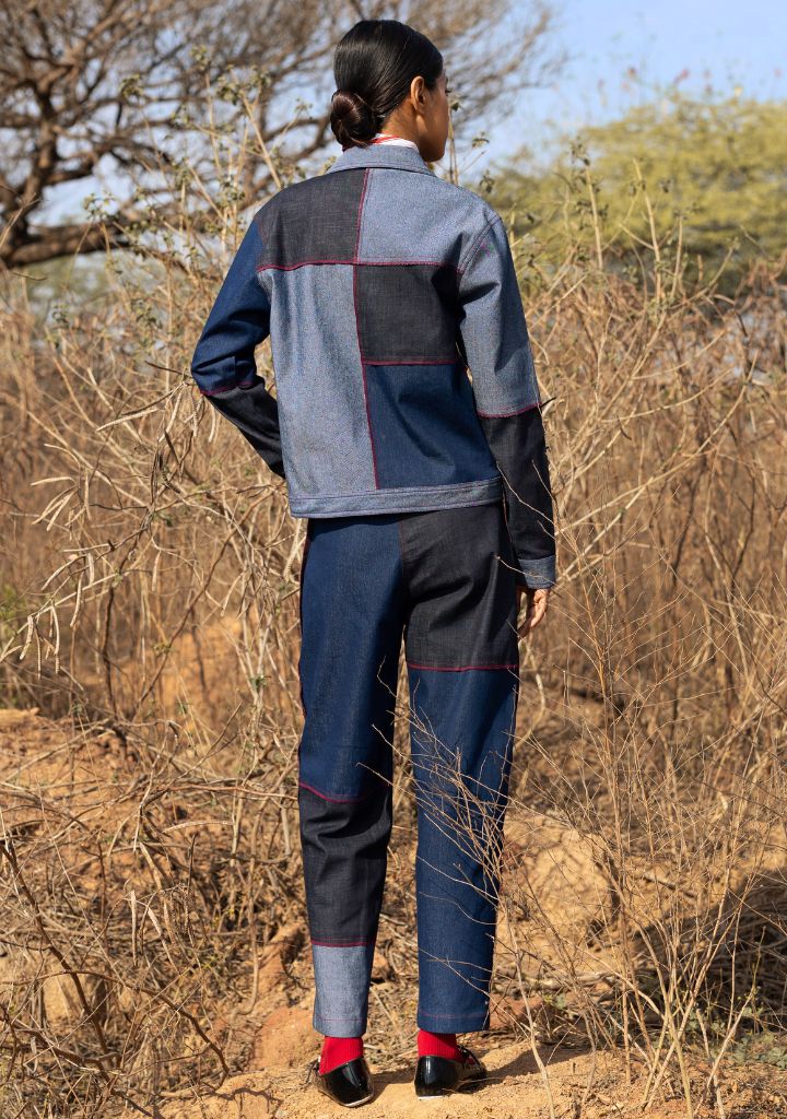 A two piece set pairing the Cherly Patch Jacket and the Eliza Tapered Pants. The panelled jacket features a front button placket, long sleeves and front pockets. Length 22". The panelled pants with thread highlights feature a fitted waist and pockets. Length 39". The model is 5'5" and is wearing size M.