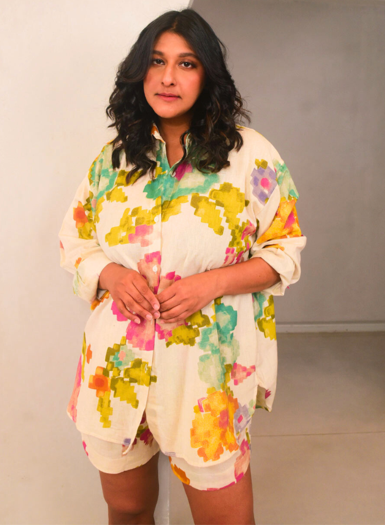 A two-piece set pairing the Em Shirt and the Em Shorts. The relaxed fitting shirt features a floral printed yoke at the front and back. Front length 29", Back length 31". The matching screen printed shorts feature an elasticated waist and inseam pockets. Length 14.5". The model is 5'6" and is wearing size L.
