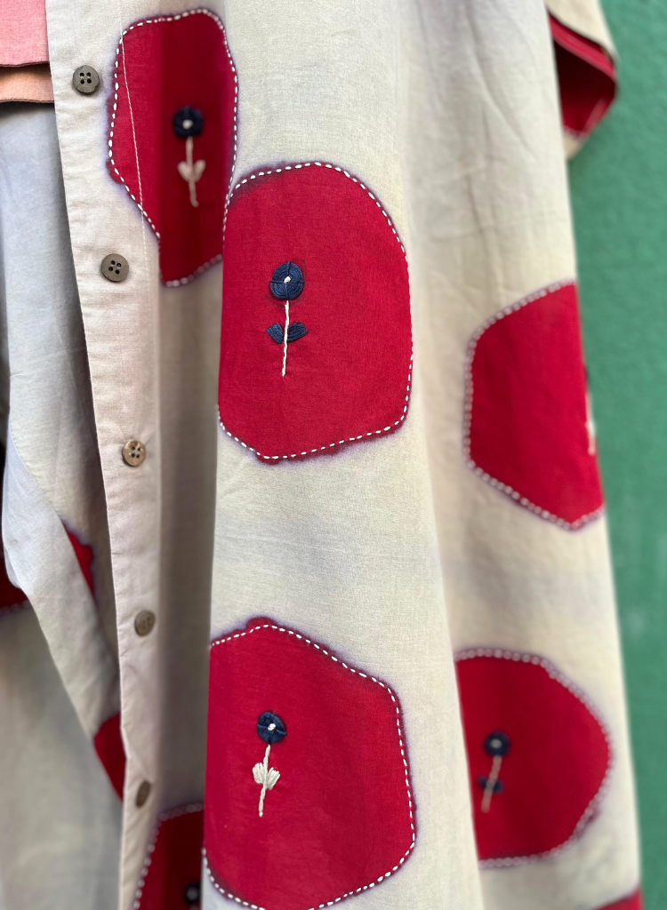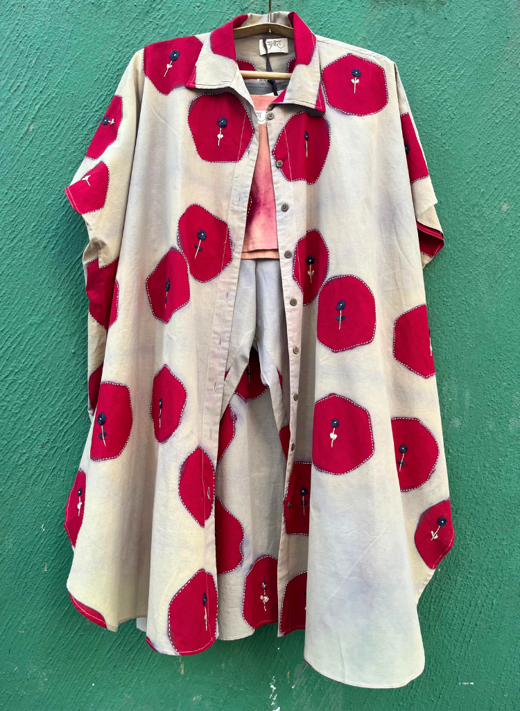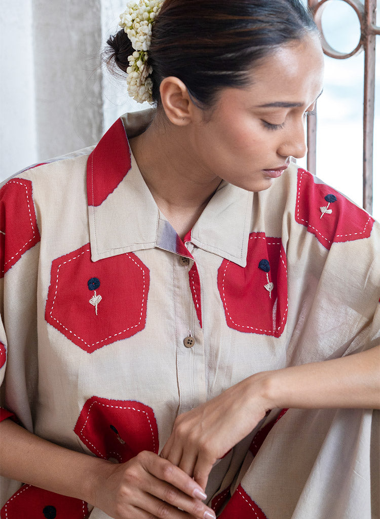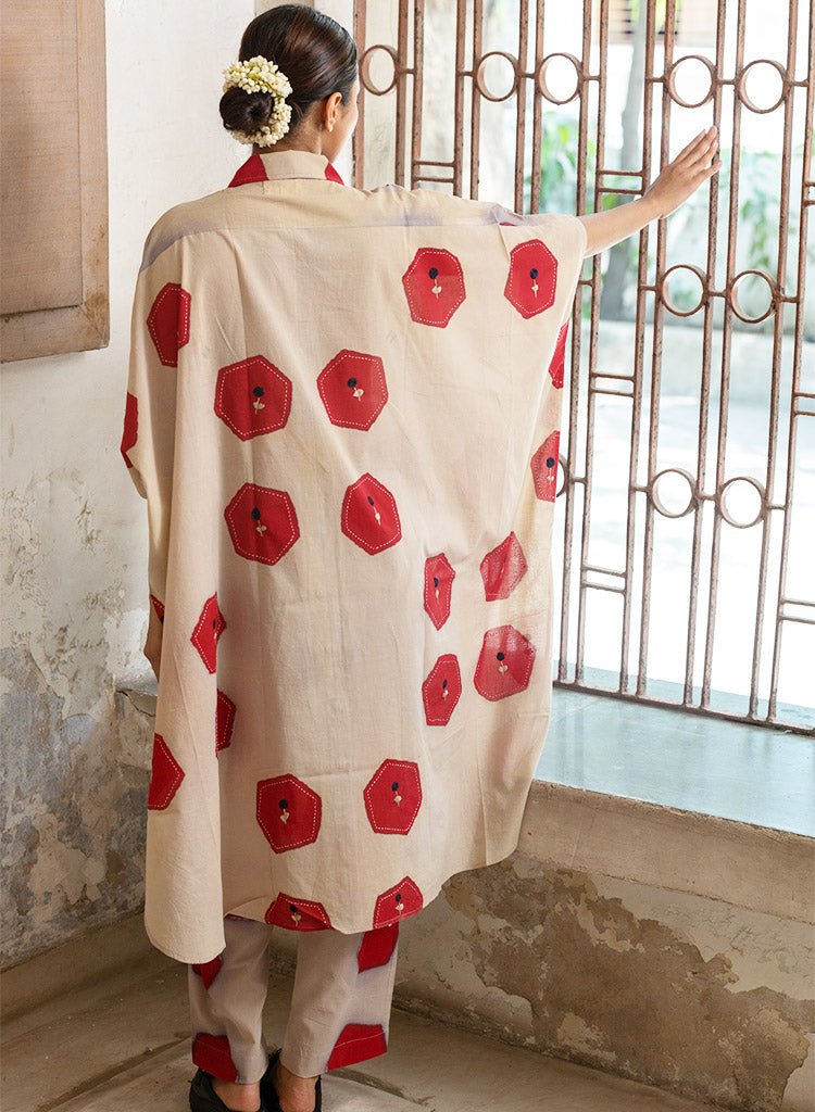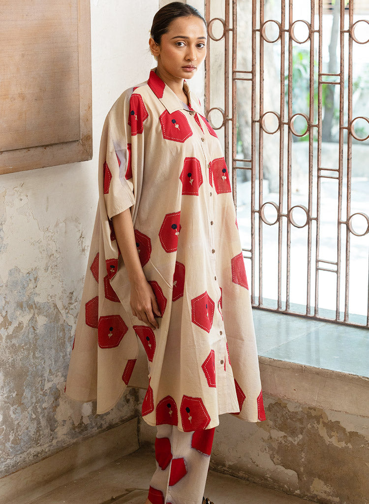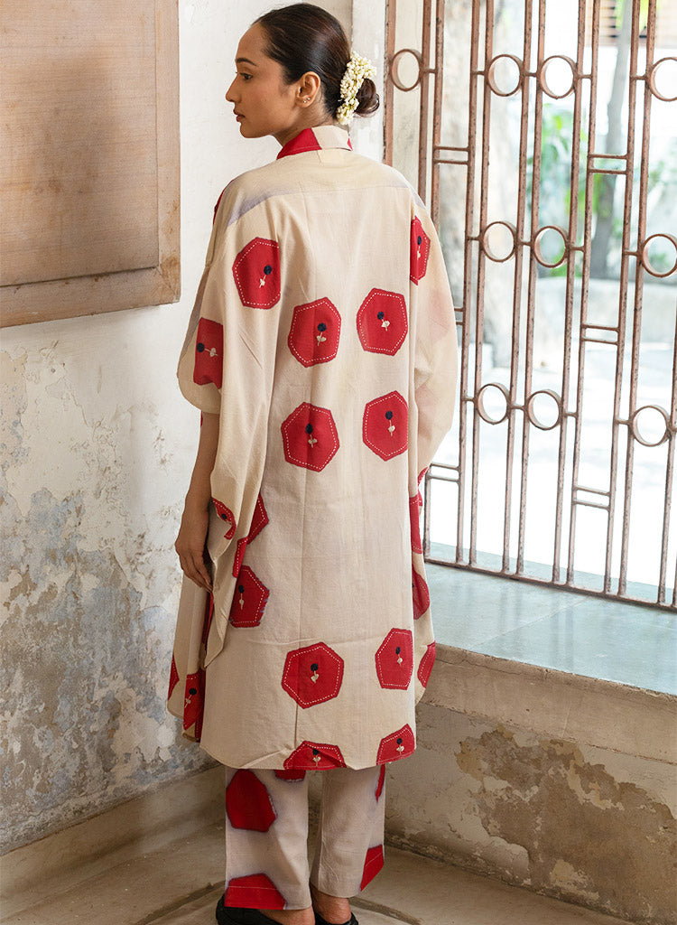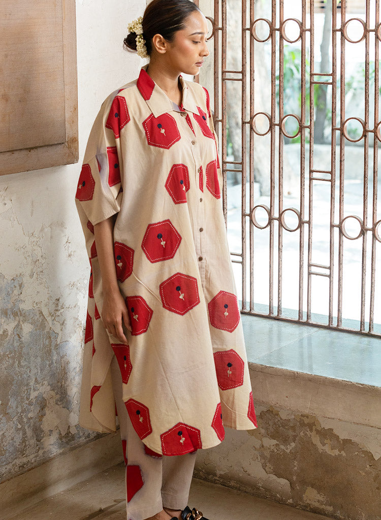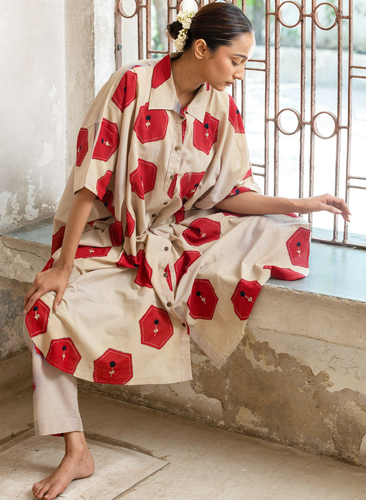 A two-piece set pairing a hexagon printed jacket and hexagon printed pants. The relaxed-fitting long jacket with hexagon blocks all-over, embellished with Kantha embroidery, a front button-down placket, a curved hem and small side slits features a classic collar and short sleeves. Length 40". The relaxed-fitting pants with matching hexagon print features an elasticated back waist belt. Length 36". The model is 5'4" and is wearing a size M.
