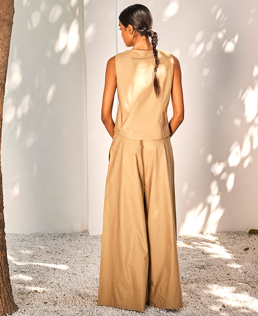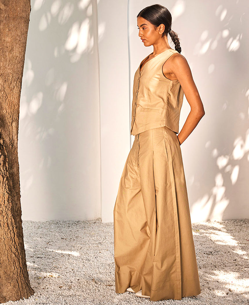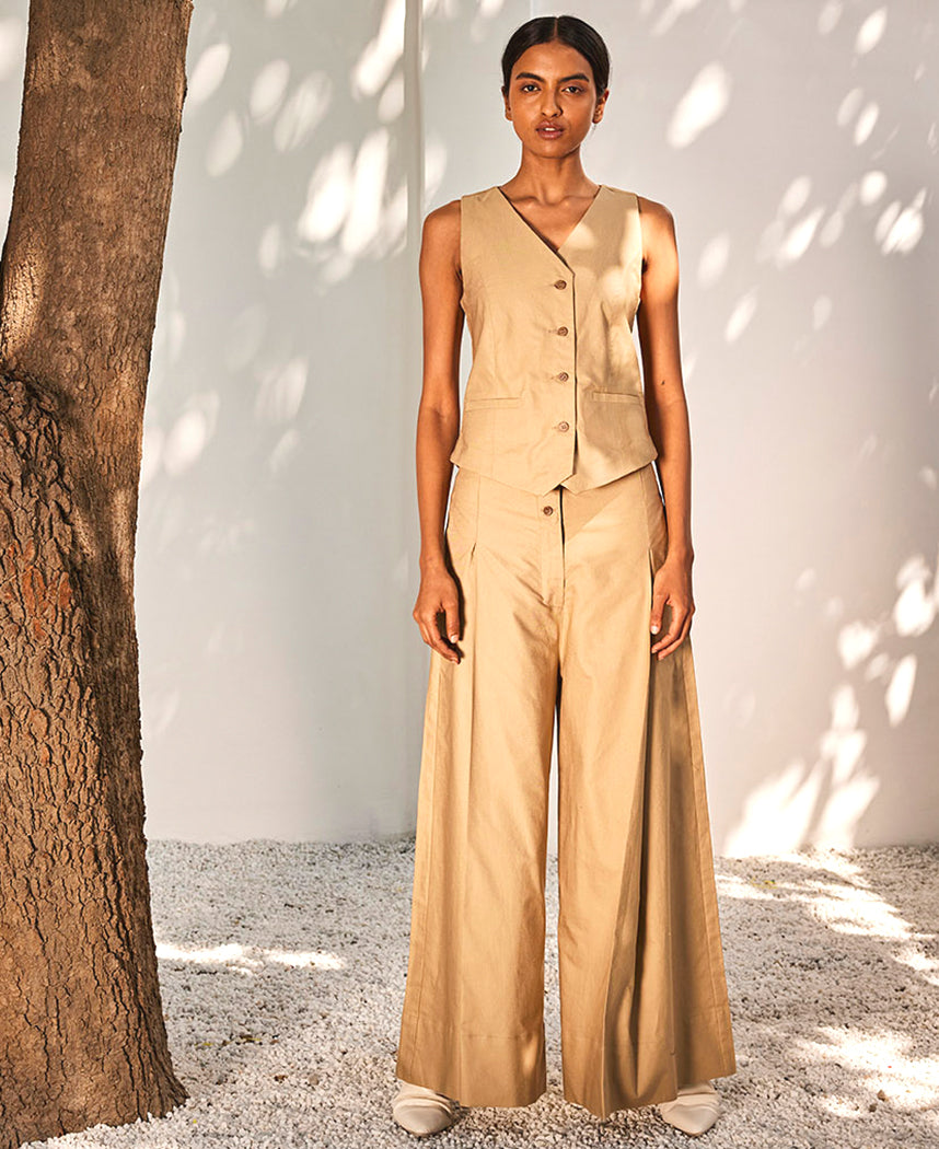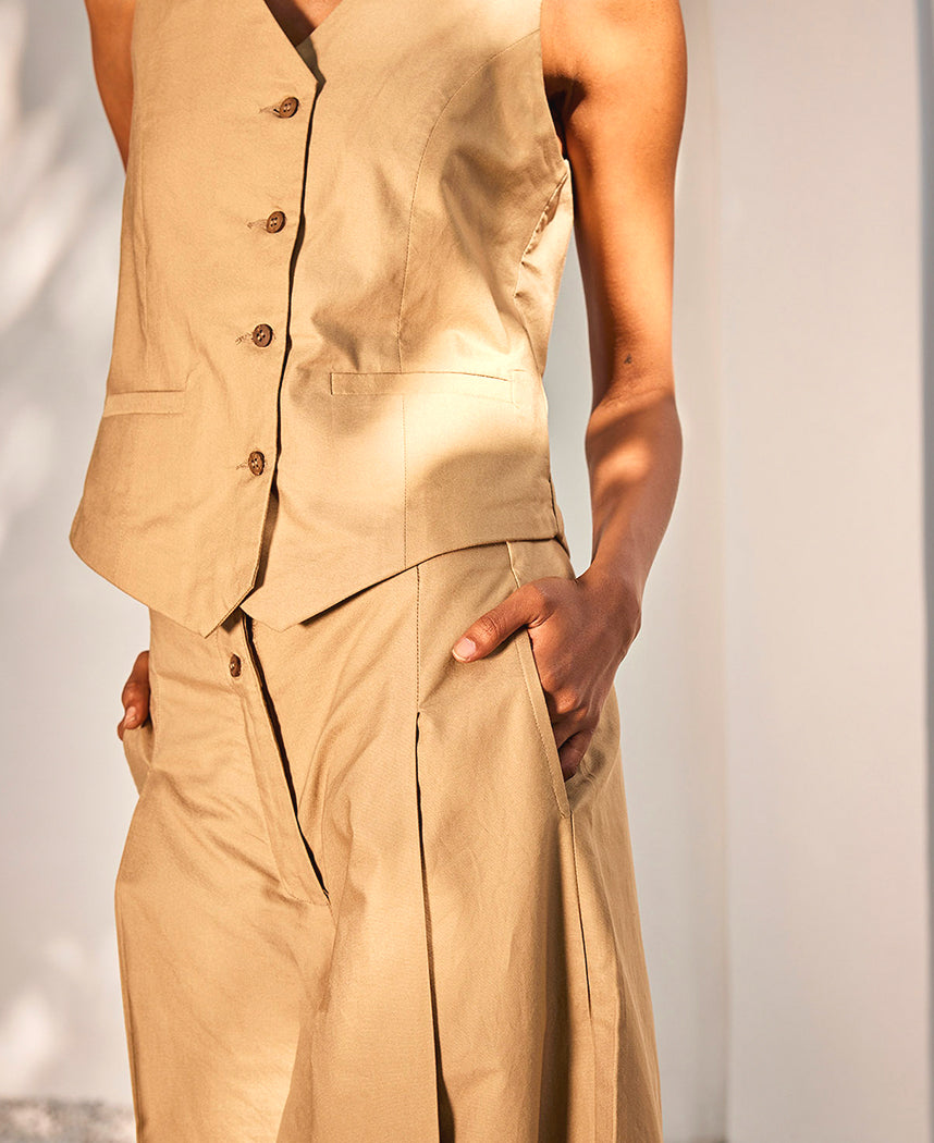 A two-piece set pairing a waistcoat and a flared pants. The waist coat features a front button placket and two pockets. Length 21.5". The flared pleated pants feature a front button opening and inseam pockets. Length 40". The model is 5'8" and is wearing size S.
