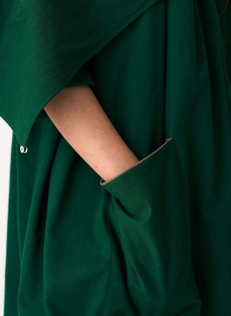 A four-piece set pairing the Notch Collar Woolen Trench Overlay, the Everyday U-hem Shirt, the High Waist Broad Bottom and the Patch Pocket Scarf. The long overlay with quilted back yoke and front pocket detail features a lapel collar and contrast piping detail. Length 49". Made in merino wool. The long tunic with U-hem curve detail features a concealed placket and classic shirt collar. Length 48". Made in satin Lycra. The solid high-waisted wide-leg pants feature side pockets and a fitted waist. Length 41". Made in satin Lycra. The contrast stripe scarf with patch pocket detail. Dimensions 90" x 25". Made in cotton twill.