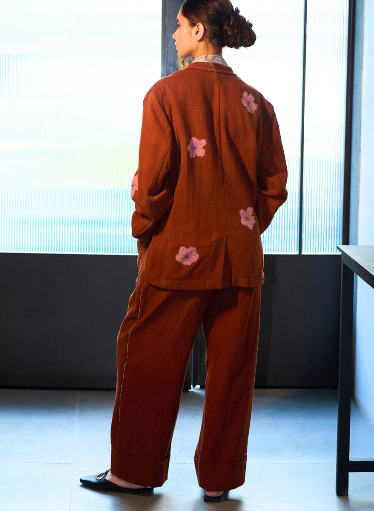 A two-piece set pairing the Oslo Rust Jacket and the Ember Pants. The jacket with appliqué floral embroidery features delicate embroidery detailing on the collar, lapel, and pockets. Length ". The relax fit pants features pleats at the front and a drawstring at the back for an adjustable fit. The model is 5'7" and is wearing size S. Made in organic cotton. Each piece is handcrafted using industrial waste and recycled fabrics, and covered in small irregular embroideries, making it as unique as your personal style.