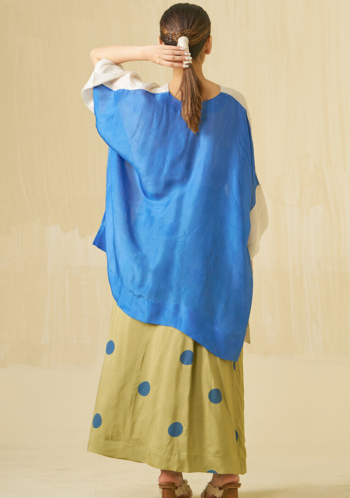 A two-piece set pairing the Penguin Top and the Penguin Pants. The oversized top with colour-blocking and side slits features neckline with center slit and 3/4th sleeves. Length 30". The maxi skirt with hand-block print features sari-style pleats in the front. Length 37". The model is 5'5" and is wearing size S.