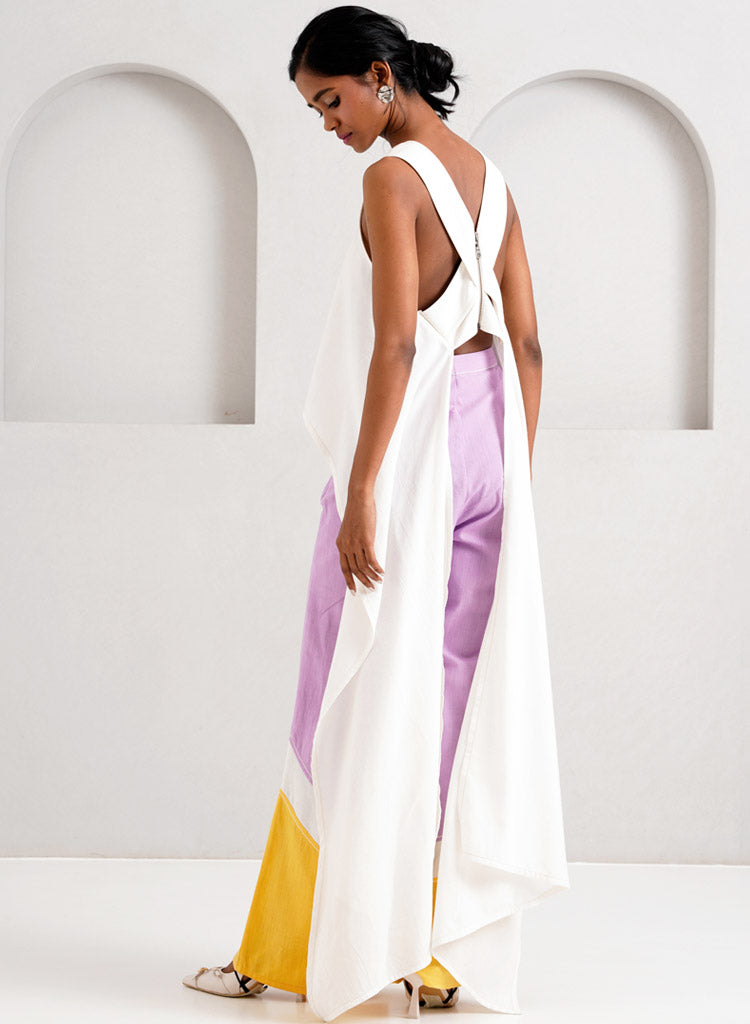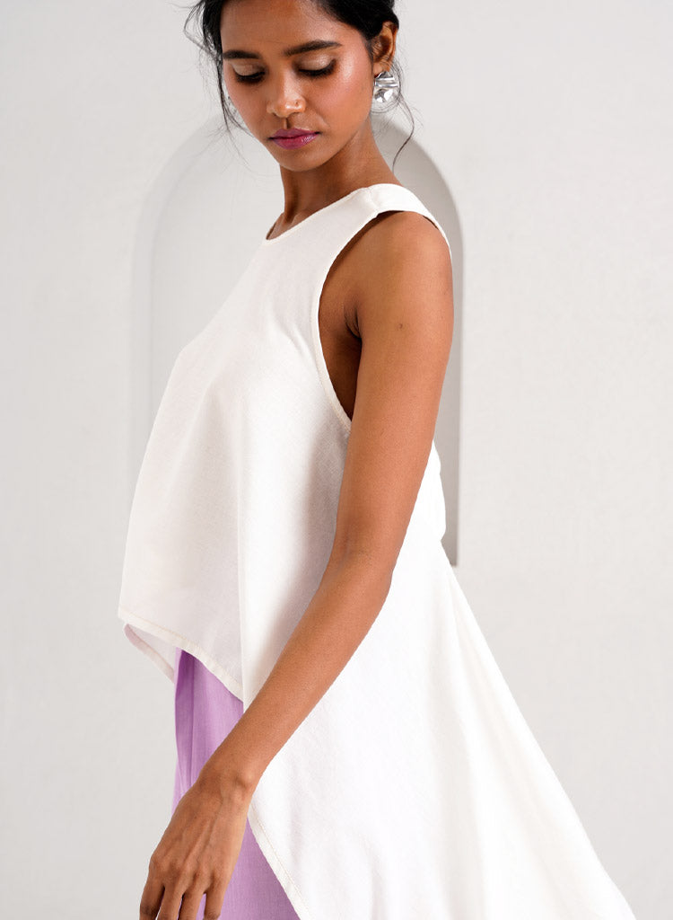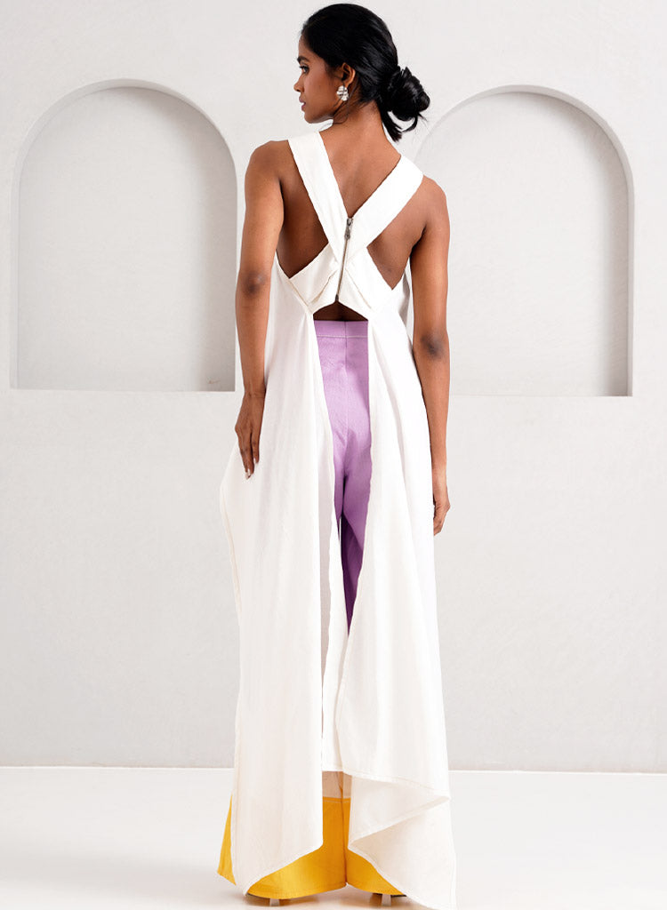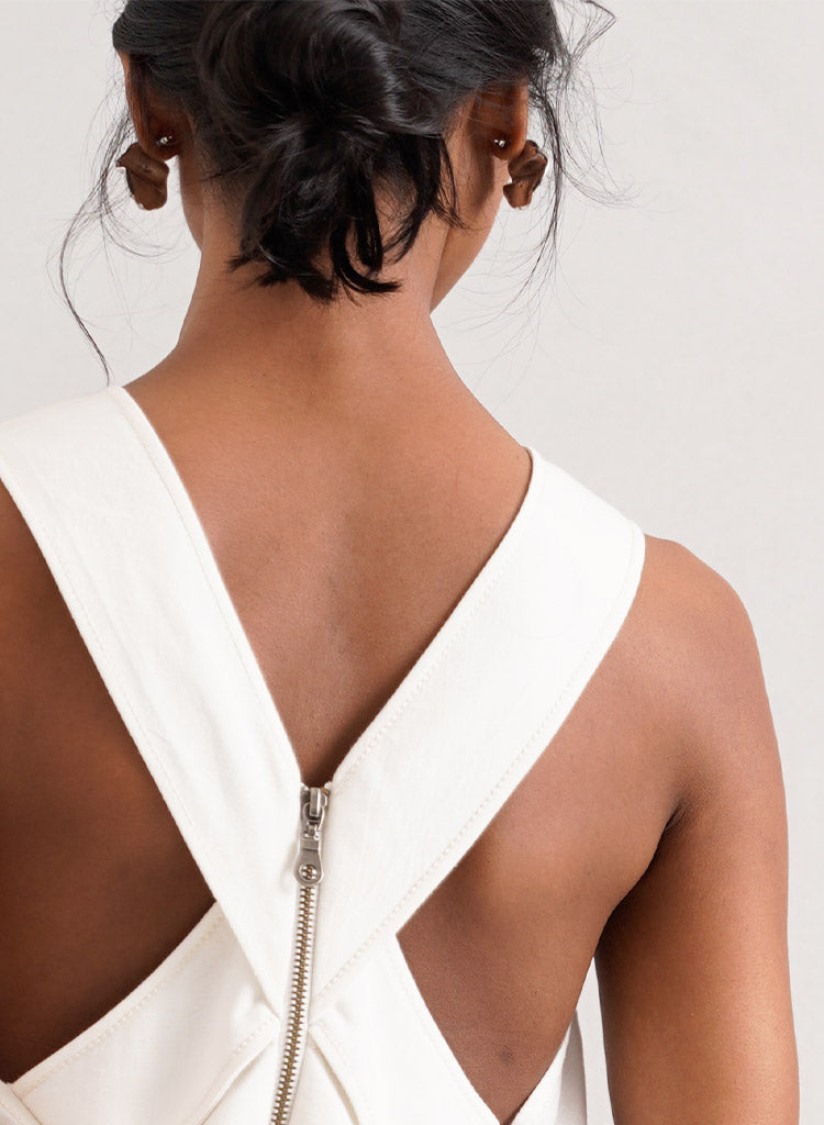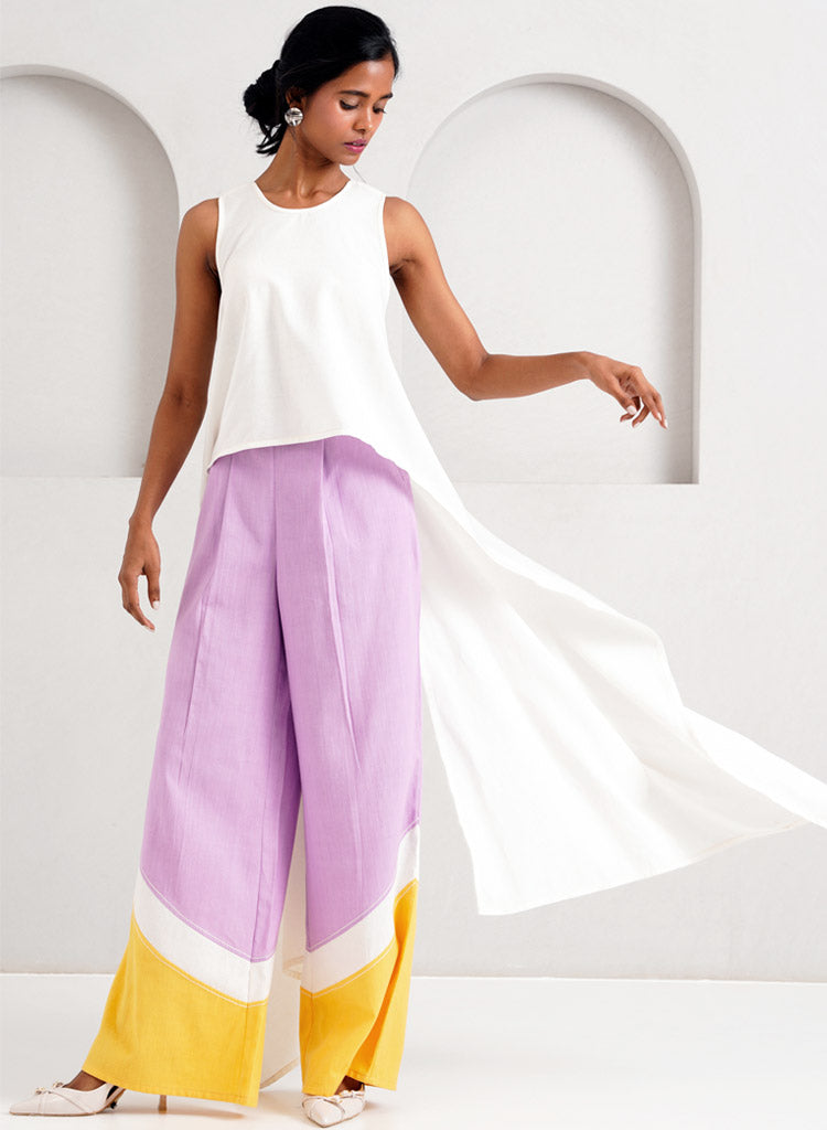 A two-piece set pairing the Rabi Troop Top and the Rabi Troop Pants. The flowy sleeveless top with a criss cross back features a round neck and a back zipper. Front length 18", Back length 50". The wide legged flat front pants feature an elasticated back and inseam pockets. Length 42". The model is 5'10" and is wearing a size S.