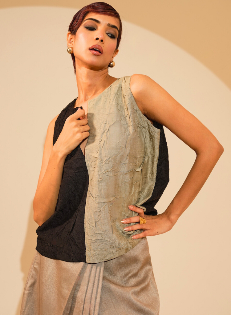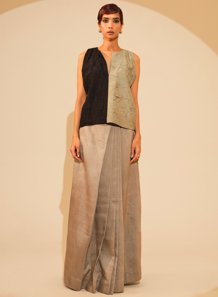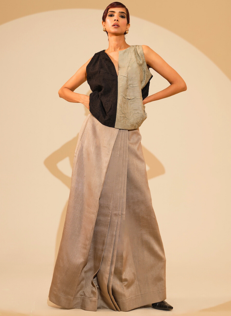 A two-piece set pairing the Stream Top and the Mist Skirt. The sleeveless top with a colour blocking detail features a round neck and in cut shoulders. Length 22". Made in crushed silk. The sari-inspired pleated skirt features sharp, sculptural pleats. Length 42". Made in Mysore silk.