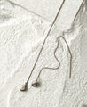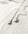 A pair of delicate thread earrings with textured stones detail handcrafted in brass. Length 16 cm.