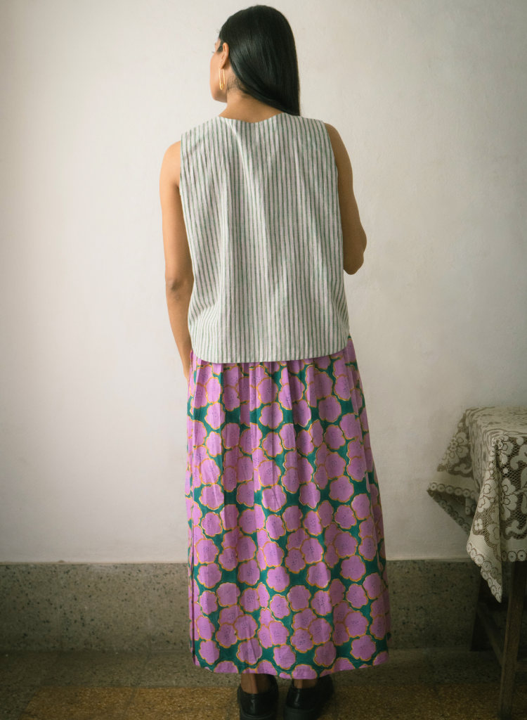 A lightweight reversible waistcoat with hand block printed floral fabric. Features tie detail and can be worn both the ways. Length 22". The model is 5'7" and is wearing a size M.