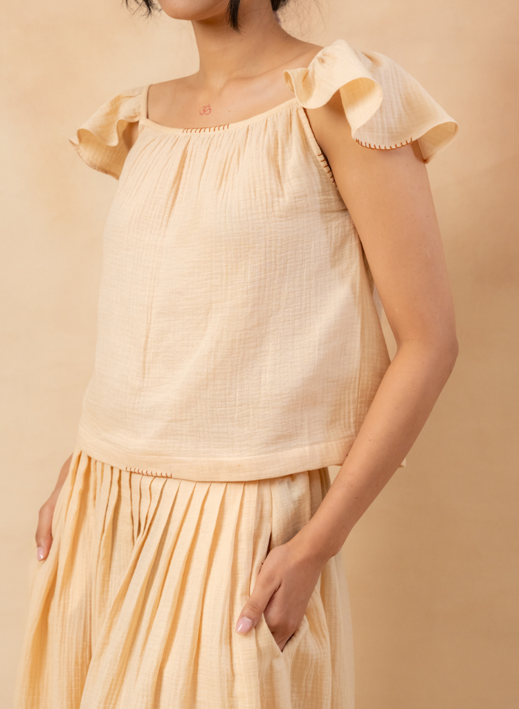 A two-piece set pairing the Honey Drop Top and the Honey Drop Skirt. The summer crop top with short mega sleeves can be styled off shoulder. Length 19". The maxi skirt with front pleats and randomly placed doodle embroidery features an adjustable back with drawstrings and side pockets. Length 36". The model is 5'8" and is wearing size S-L.