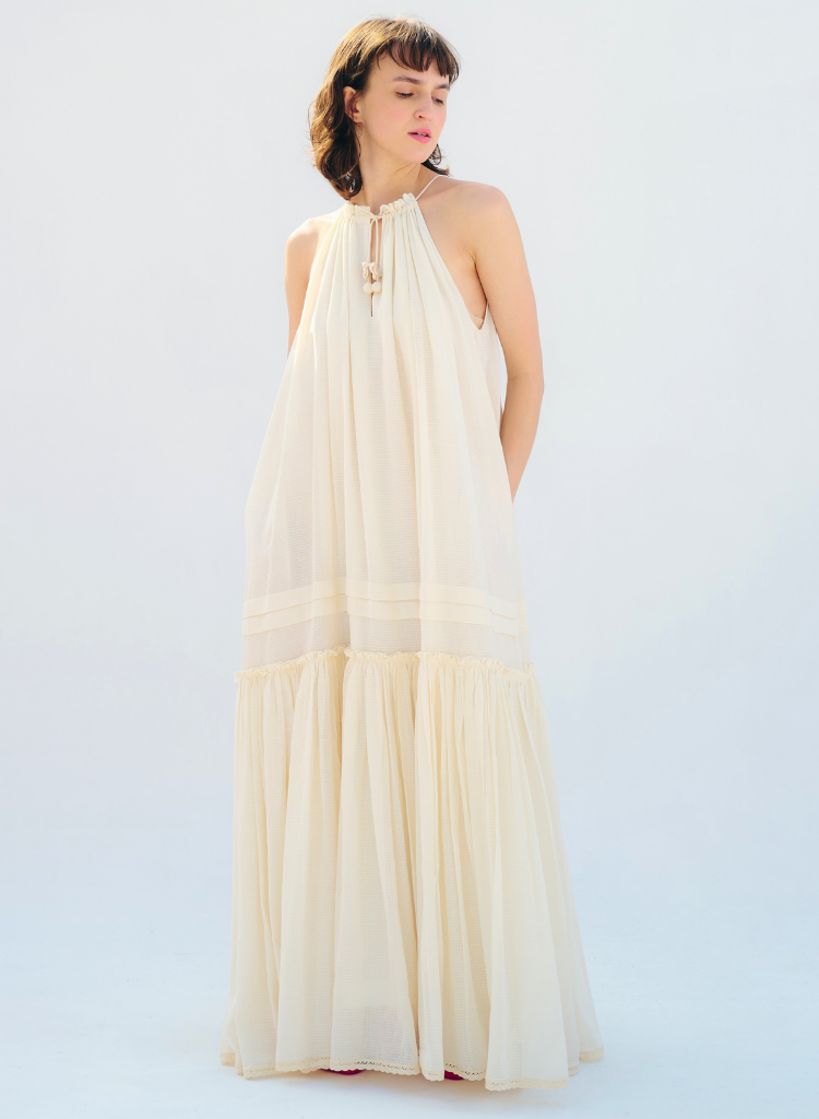 An anti-fit maxi dress featuring a halter neck and drawstrings to adjust the neck & armhole. Length 54". The model is 5'9" and is wearing a free size.
