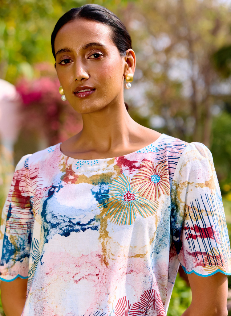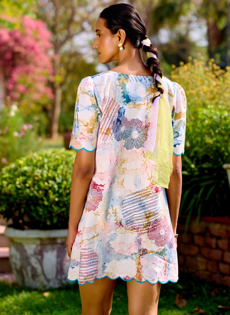 A block printed mini dress with scallop details featuring a boat neck and inseam pockets. Length 34". The model is 5'9" and is wearing a size S.