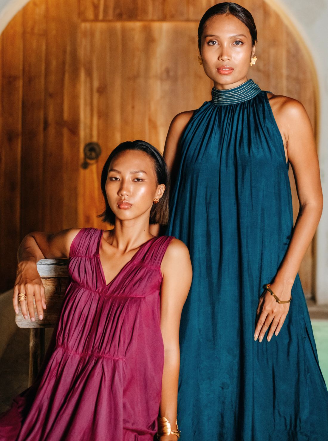 A double-layered maxi dress with a gathered halter neckline highlighted with contrast stitch details featuring a back keyhole fastening and side pockets. Length 51". The model is 5'8", and is wearing size S.