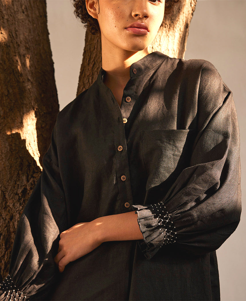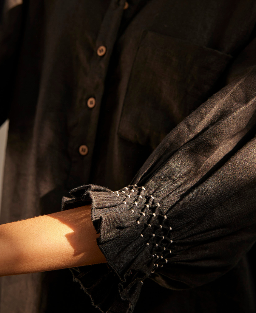 A midi dress with smocking details on the sleeves. Features a mandarin collar, front patch pocket, inseam pockets and side slits. Length 47". The model is 5'10" and is wearing size S.