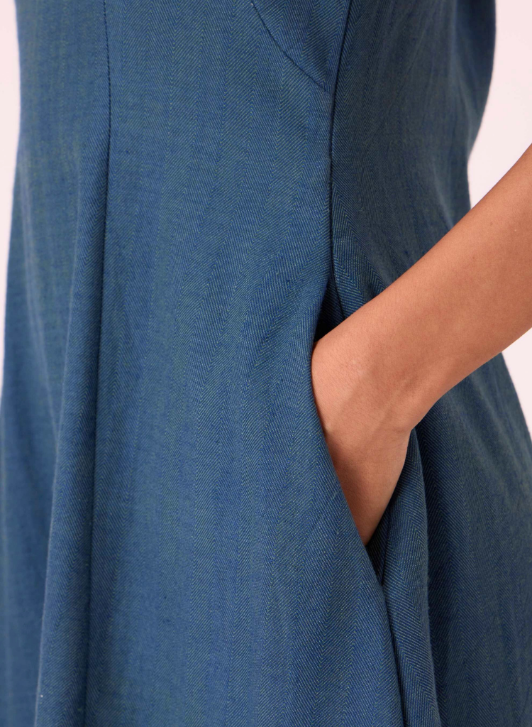 A fit and flare V-neck dress with a flattering panel detail featuring in-seam pockets and side zip. The model is 5'6" and is wearing size XS.