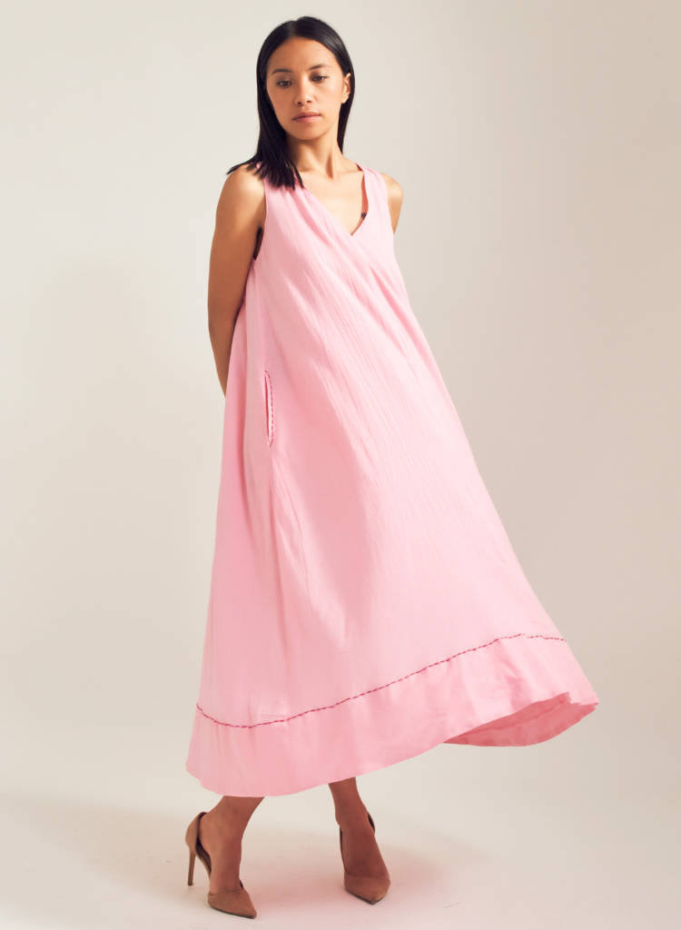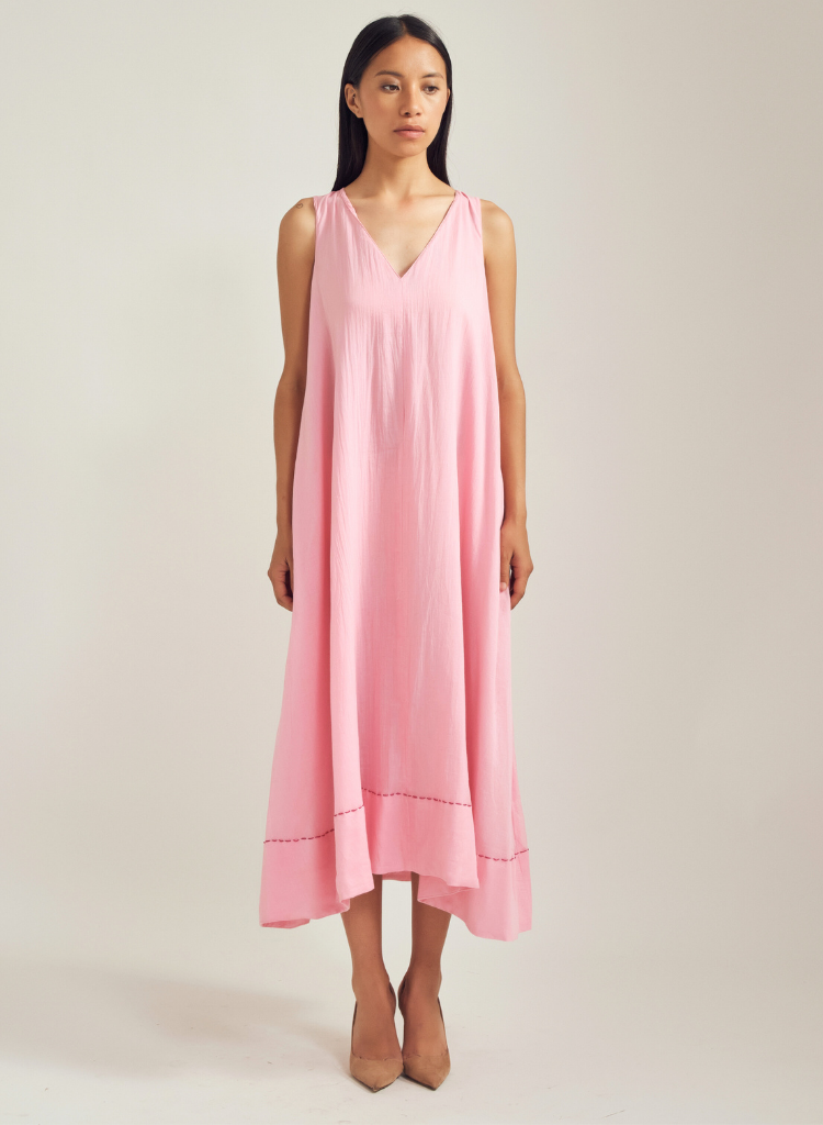 A relaxed fitting midi dress with pleat details at the back featuring a V neck and a running stitch along the pockets and hem line. Length 48". The model is 5'6" and is wearing size XS.