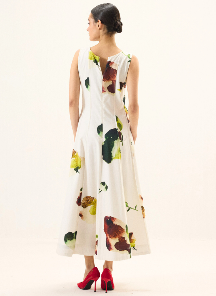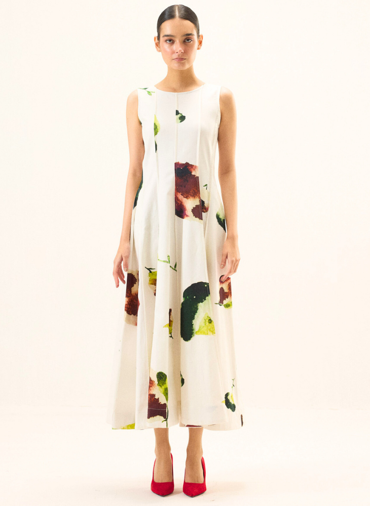 A flowing sleeveless dress with bold floral motifs featuring delicate pintucks. Length 52.5". The model is 5'6" and is wearing a size S.
