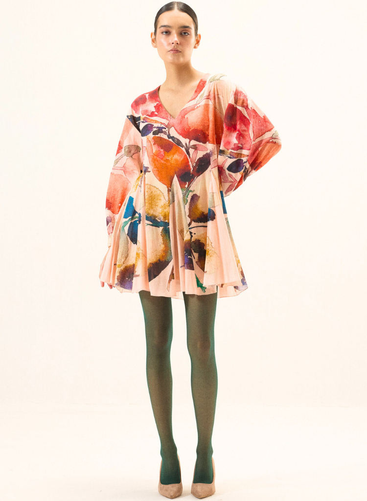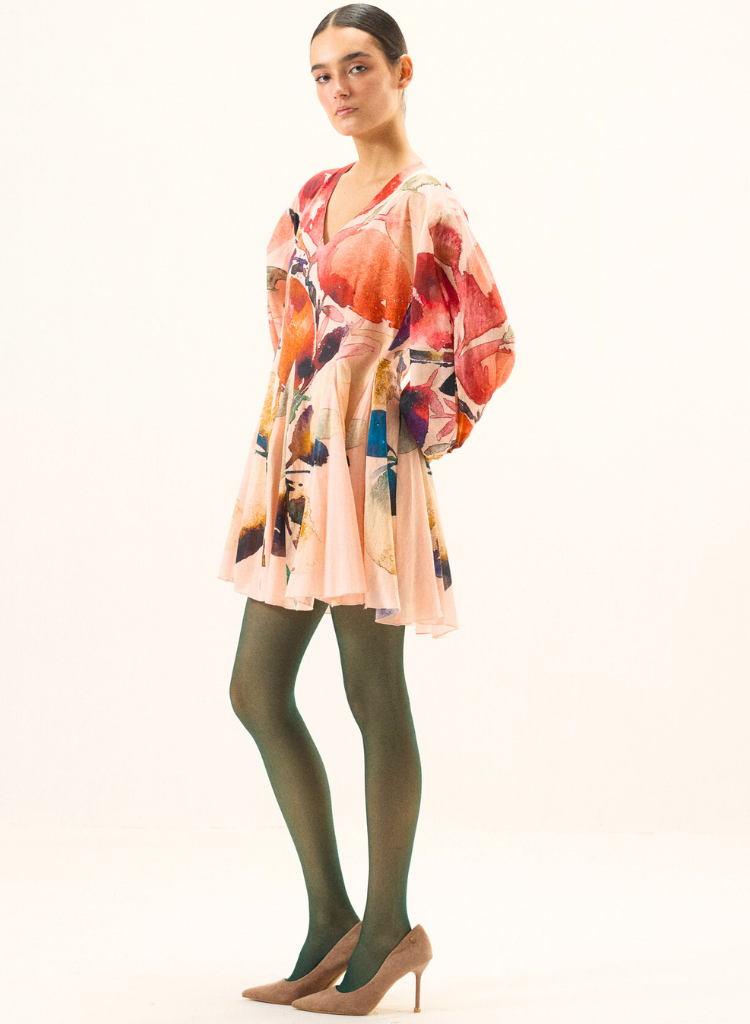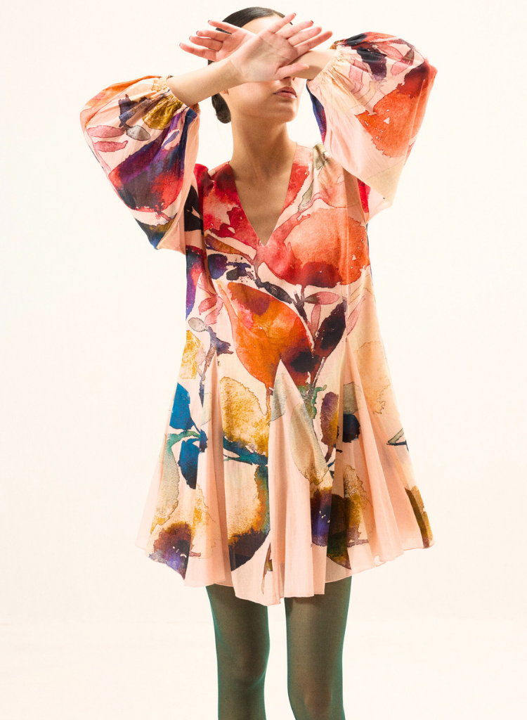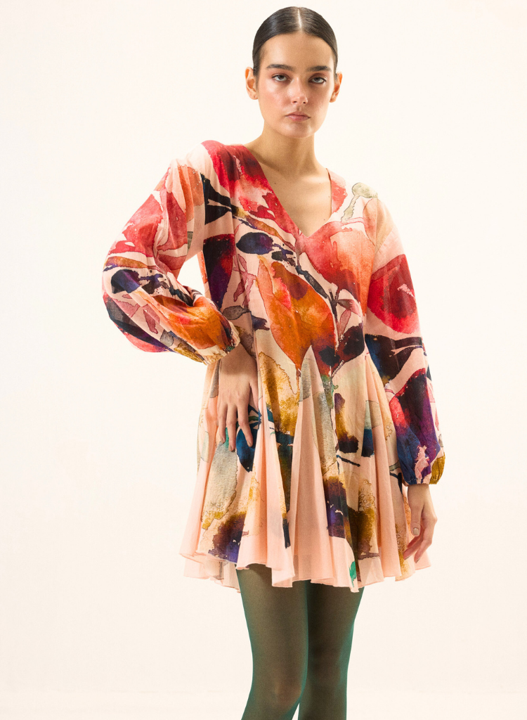 A mini dress with floral print featuring a V-neck, puff sleeves with elasticated cuffs and godet panels at the hem. Length 34". The model is 5'6" and is wearing a size S.