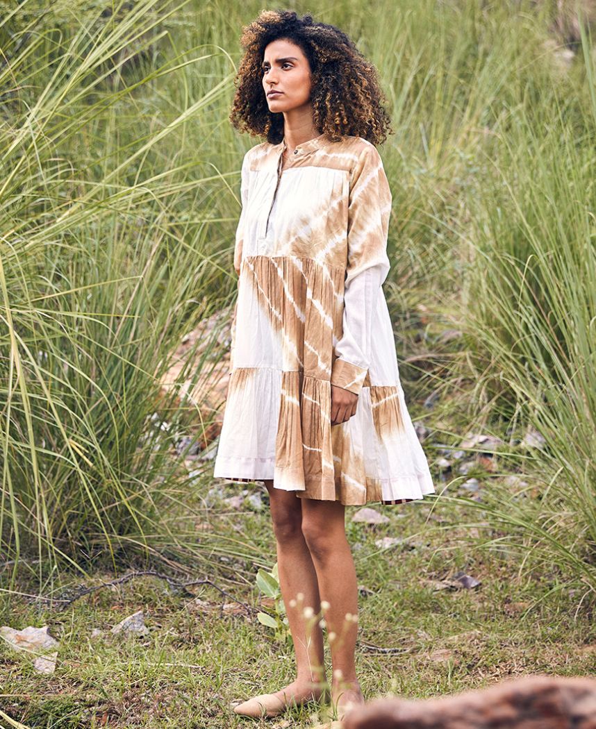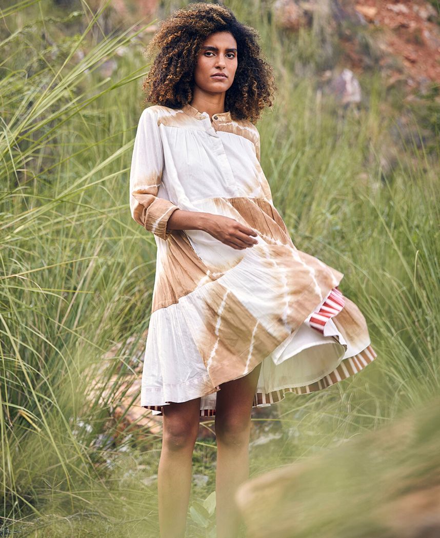 A tie dyed tiered mini dress featuring a mandarin collar, a front button placket, cuffed sleeves and inseam pockets. Length 35".