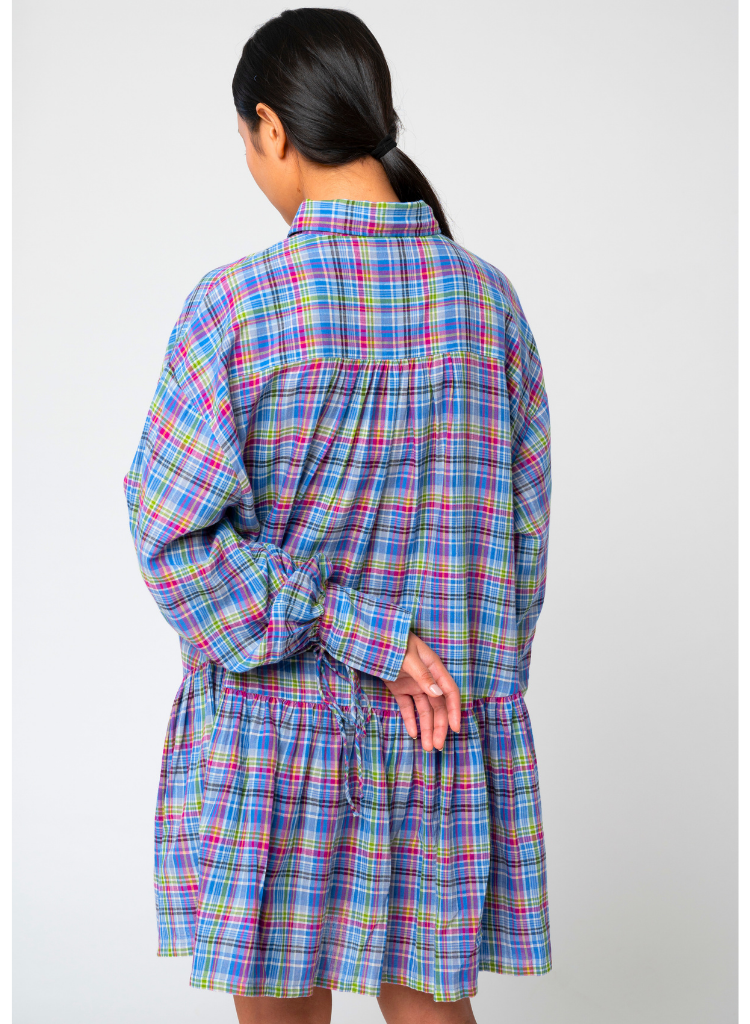A relaxed fit midi dress featuring a shirt collar, blouson sleeves with cuffs and front buttons . Length 34". The model is 5'5" and is wearing a size S.