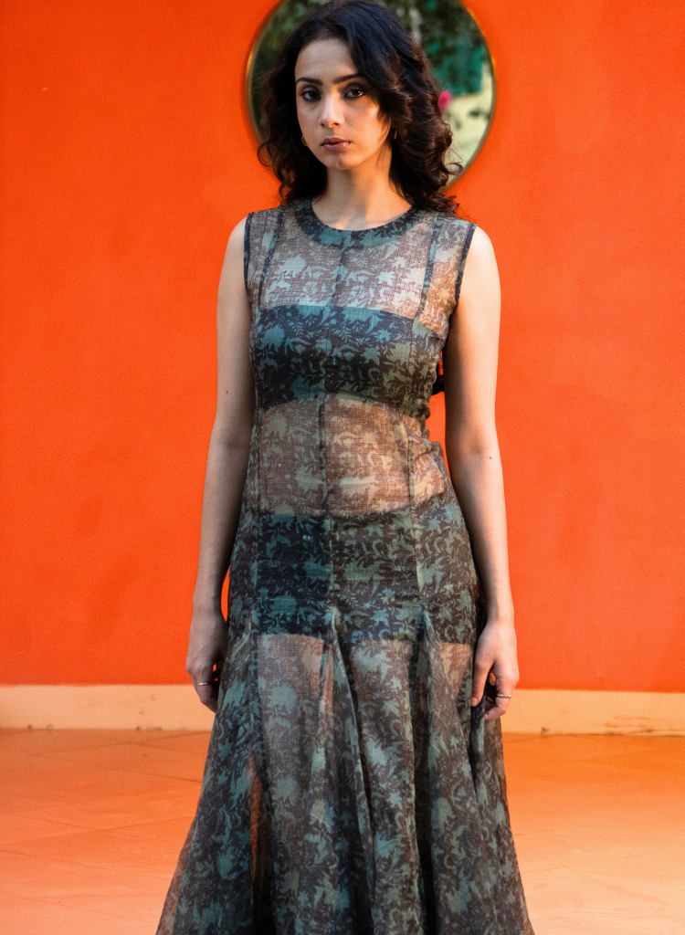 A maxi dress featuring wide, sleeveless shoulders and clean bodice that fall into a flared skirt constructed from multiple Kalis, allowing the print to drift, overlap, and diffuse beautifully as you move. Entirely sheer, the dress creates an atmosphere of layered colour and soft shadow, with each step revealing new depths of pattern while still feeling weightless. Length 53". The model is 5'8" and is wearing a size XS.