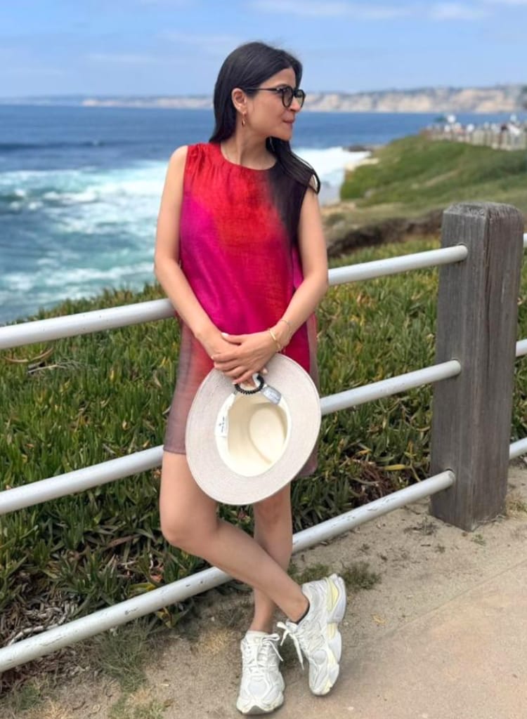 A sleeveless shift dress featuring a relaxed fit with a flattering round neckline. The model is 5'7" and is wearing size S.