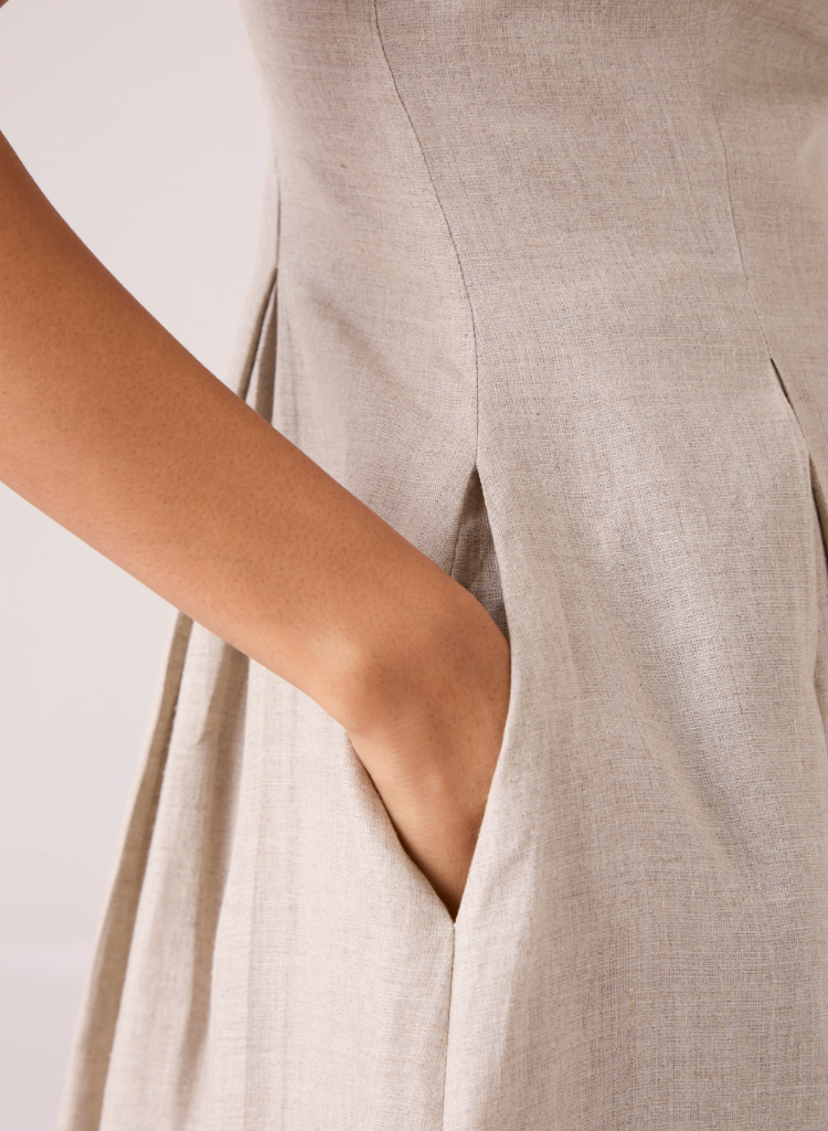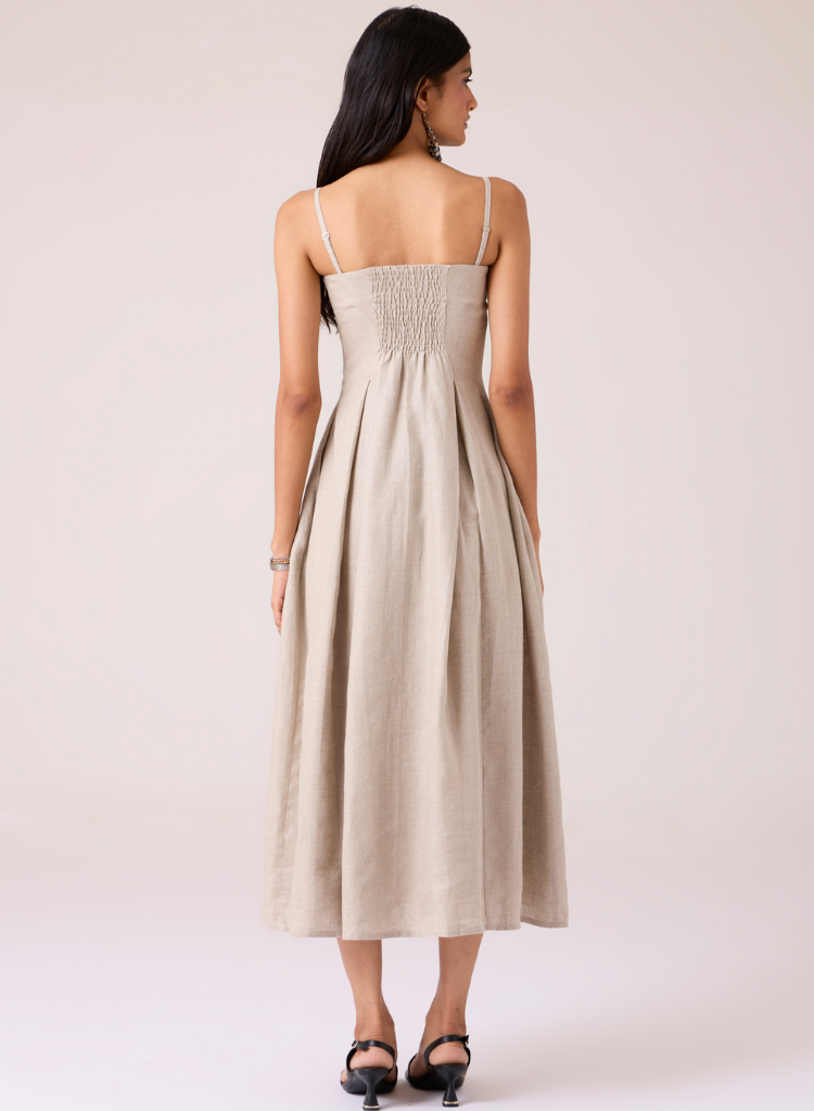 A tube midi dress with an embroidered neckline featuring a smocked back and concealed side zipper. The model is 5'9 and wearing a XS.