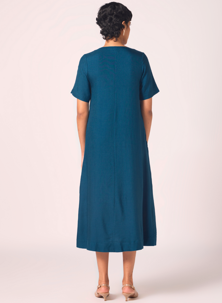 A midi dress featuring a sharp V-neck with a concealed facing, in-seam pockets and set-in sleeves tailored for clean drape. The model 5'8 and wearing a size S.