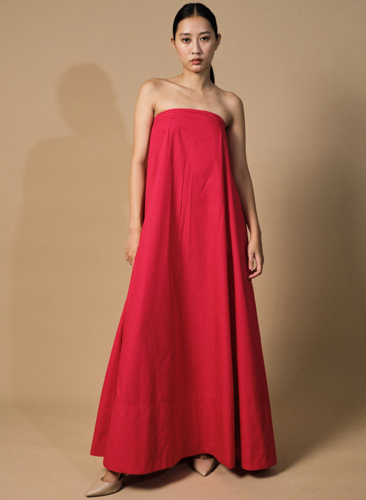 A maxi tube dress with a flared hem featuring a structured neckline, inseam pockets and elasticated back. Length 49". The model is 5'7" and is wearing size XS.