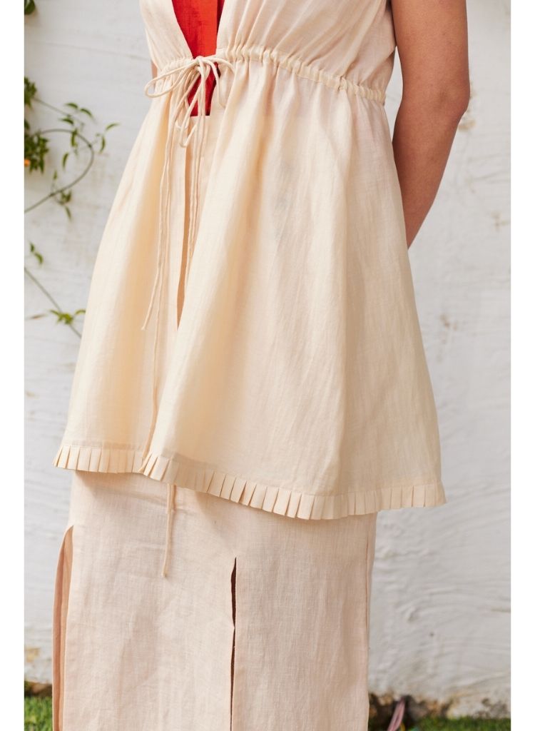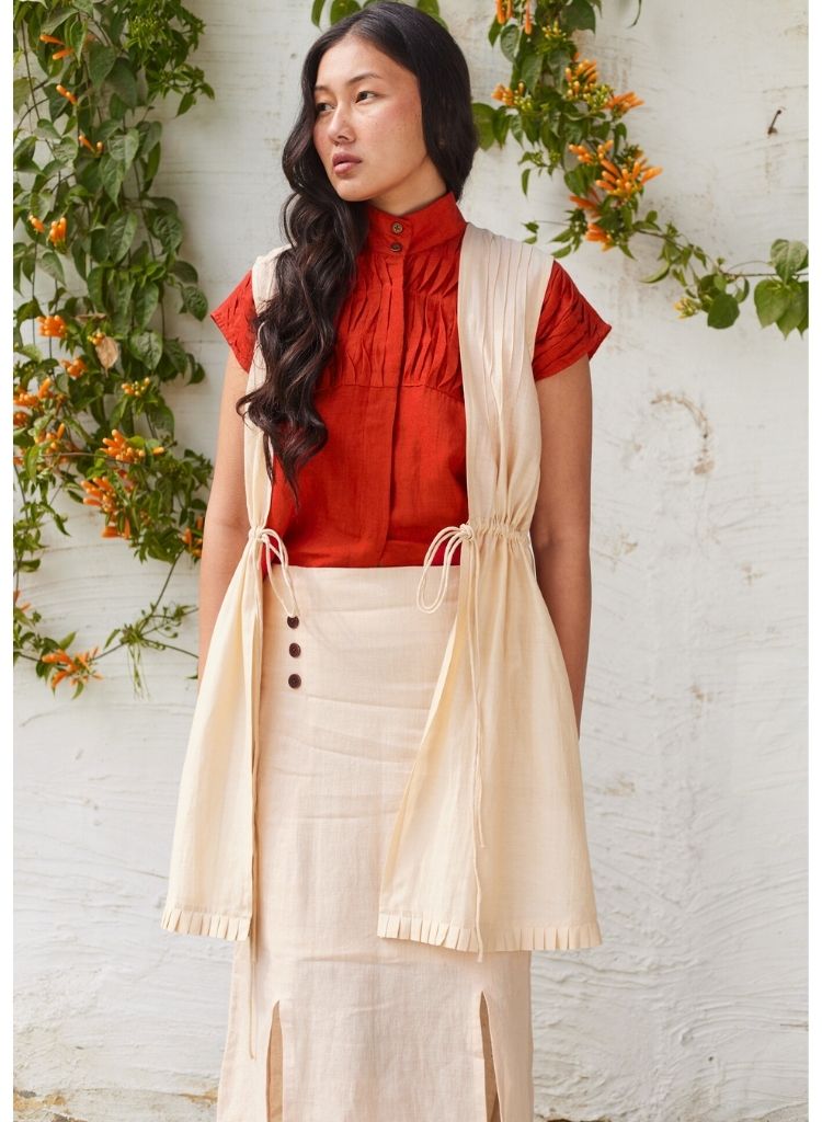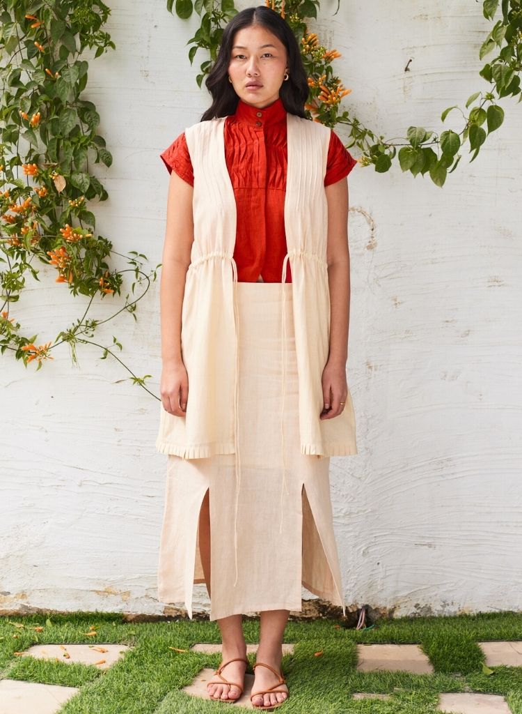 A three-piece set pairing the Shoreditch Shirt, the Southbank Serenity Midi Skirt and the Camden Market Comfort Jacket. The cap sleeve shirt with ruching detail and a concealed front button-down placket feature a buttoned high neck and slight gathers at the back yoke. Length 20". The straight-fitting midi skirt with two front slits at the hem and button detail features a side concealed zipper fastening. Length 34". Made in linen. The sleeveless jacket with pintuck detail on the shoulder, pleats at the hemline and an adjustable drawstring waist features side pockets. Length 36". Made in cotton silk.