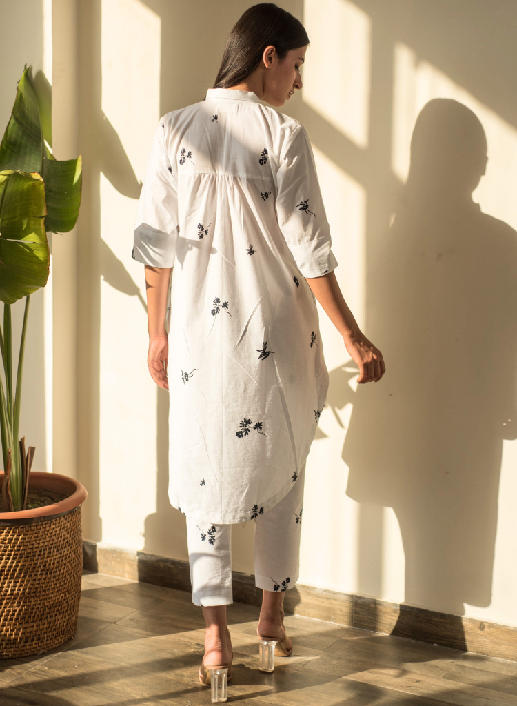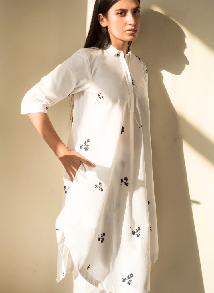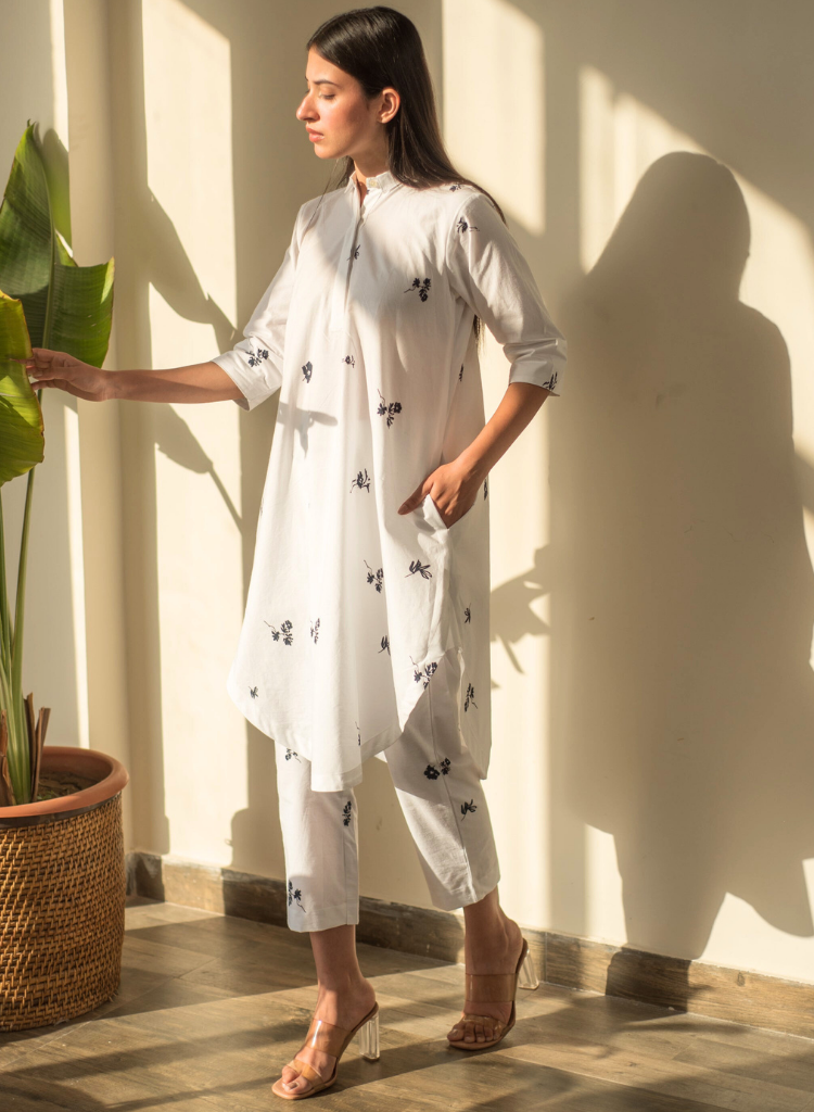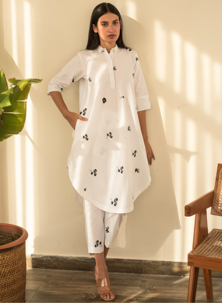 A two-piece set pairing a collared tunic and matching pants. The collared tunic features a half concealed placket, a high-low hem and 3/4th sleeves. The pants feature an elasticated waist and inseam pockets. The model is 5'6 and is wearing size S.