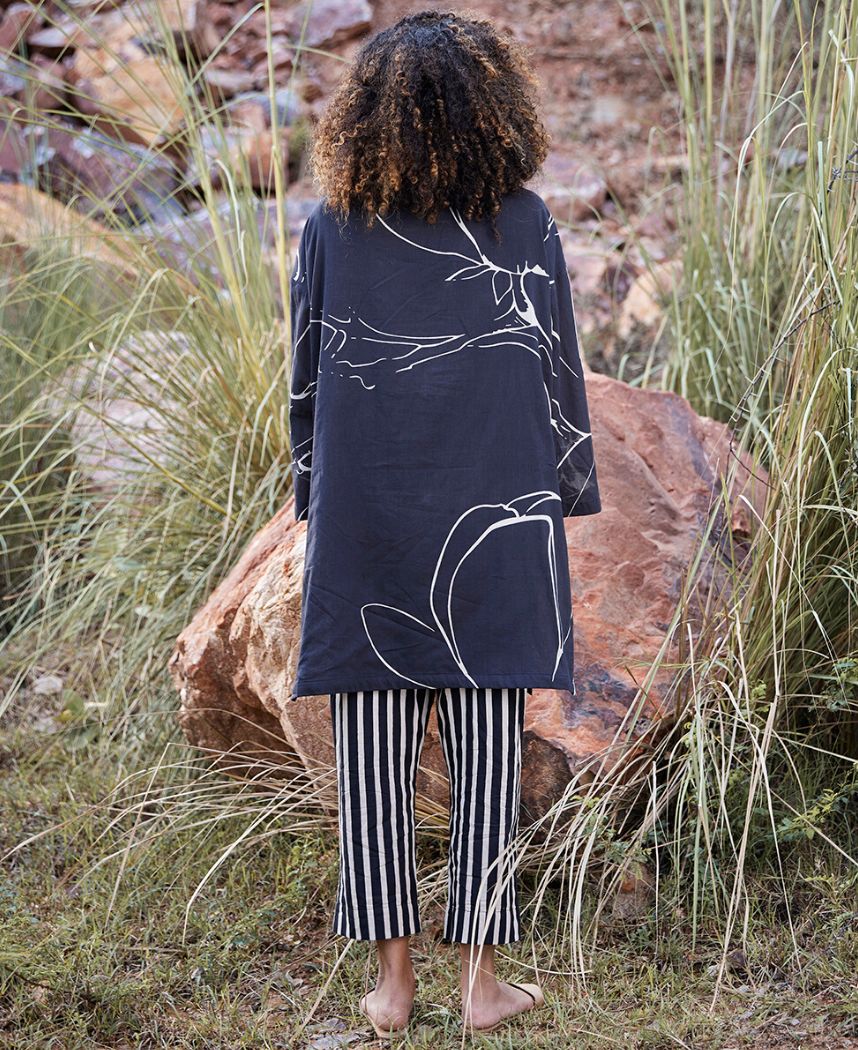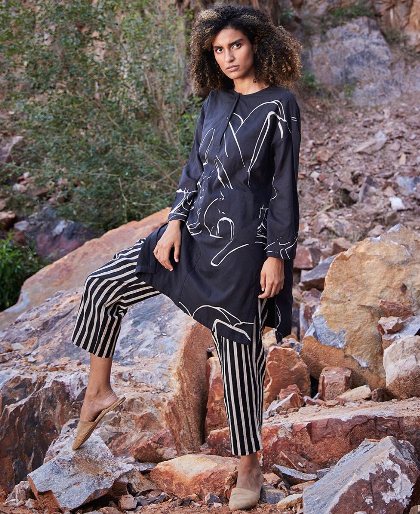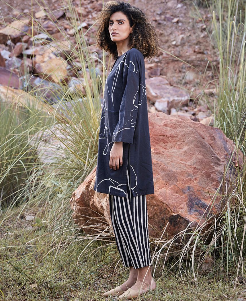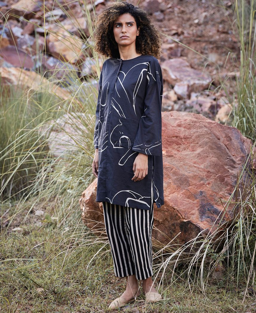 A two-piece set pairing a floral printed tunic and a striped pants. The floral printed tunic features a round neck, a front button placket, side slits and front pockets. Length 35.5". Fully lined. The striped pants feature a zipper opening. Length 35". The model is 5'8" and is wearing size S.