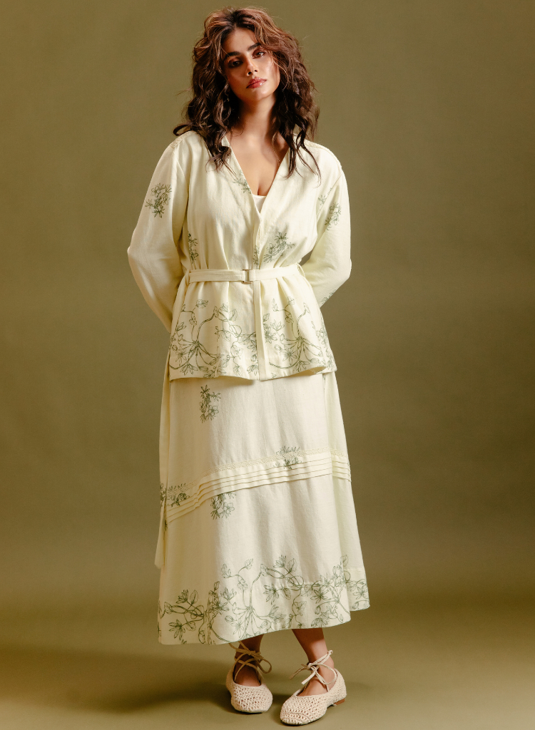 A skirt featuring a floral print with tuck detailings. Length 32". The model is 5'7" and is wearing a size S.