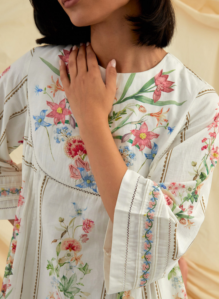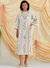 A midi dress with elegant floral panels, pleated detailing, and delicate embroidery featuring a closed round neckline and wide 3/4th sleeves. Length 48".