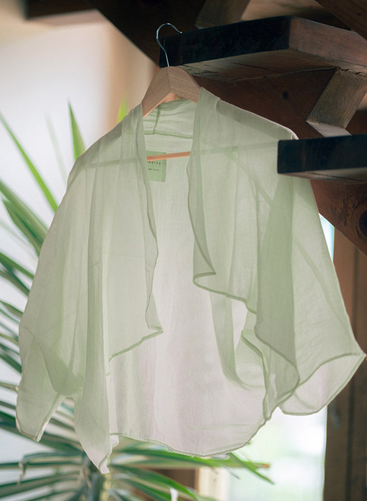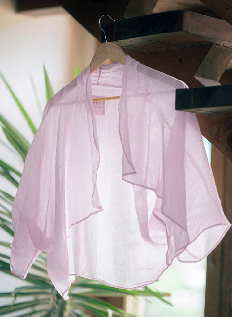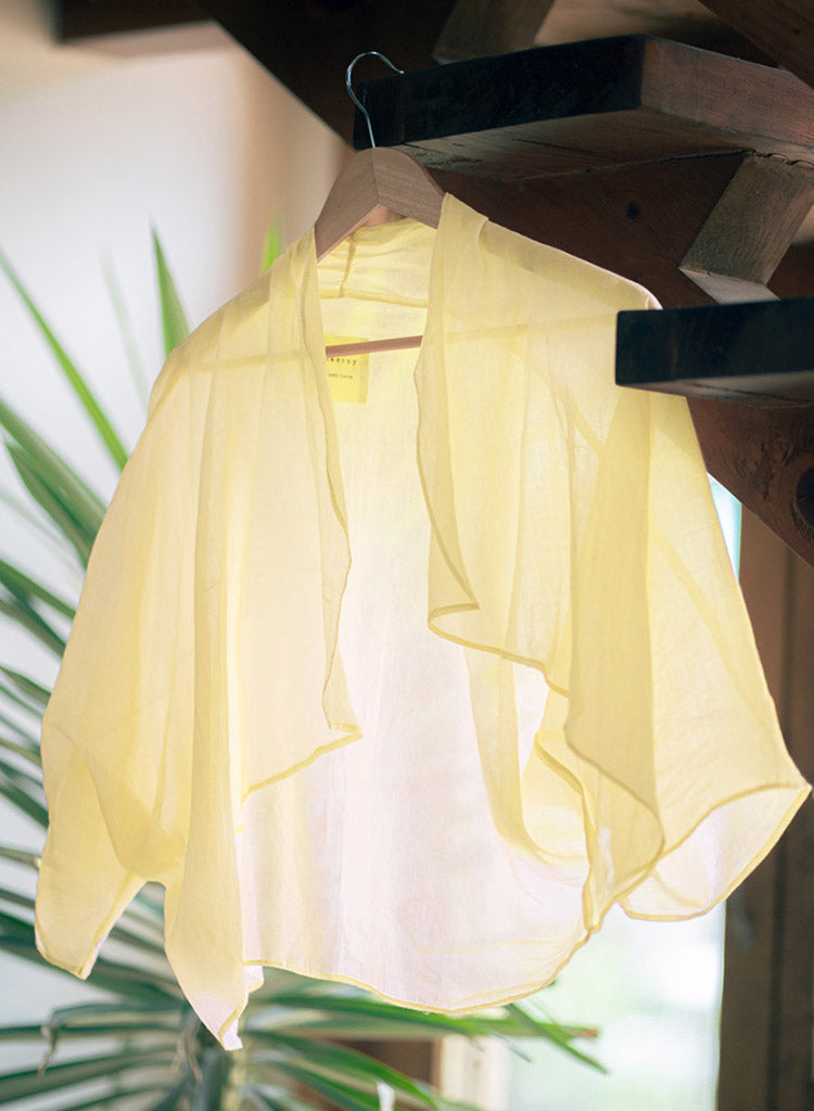 A cropped sheer open overlay featuring lapel collar. Length 27". The model is 5'8" and is wearing a size S.