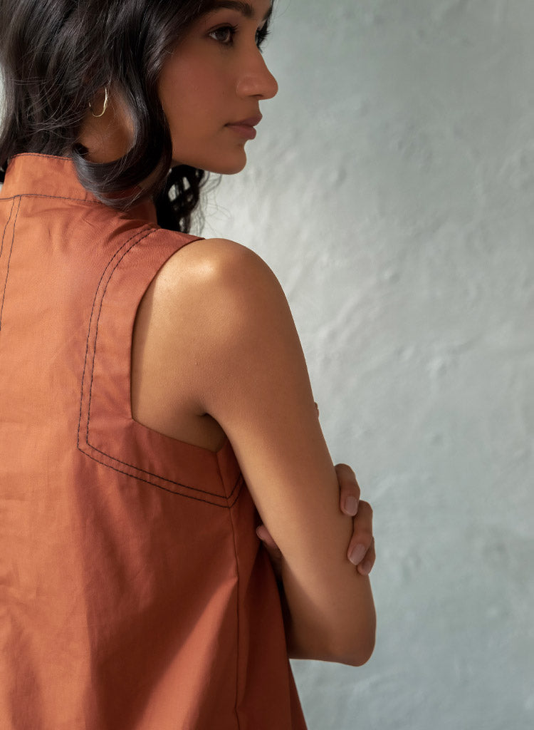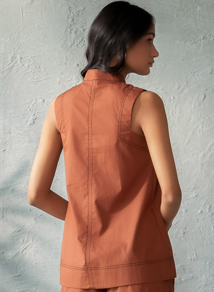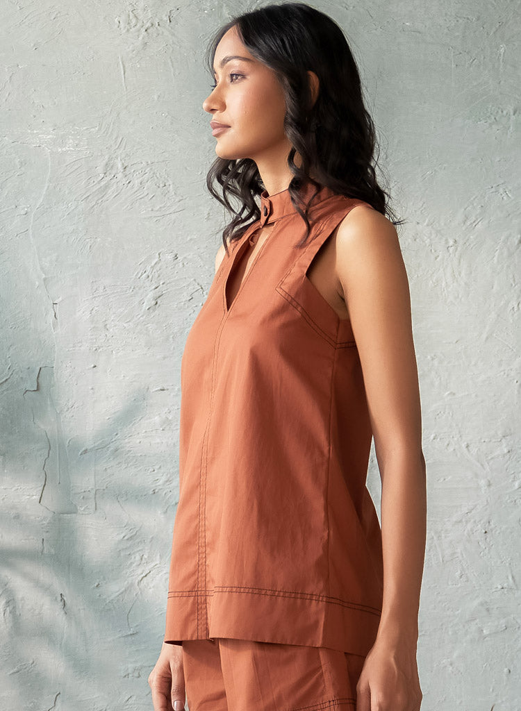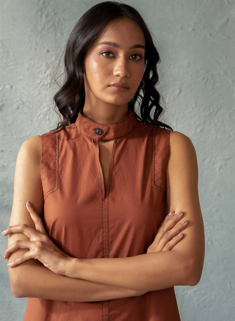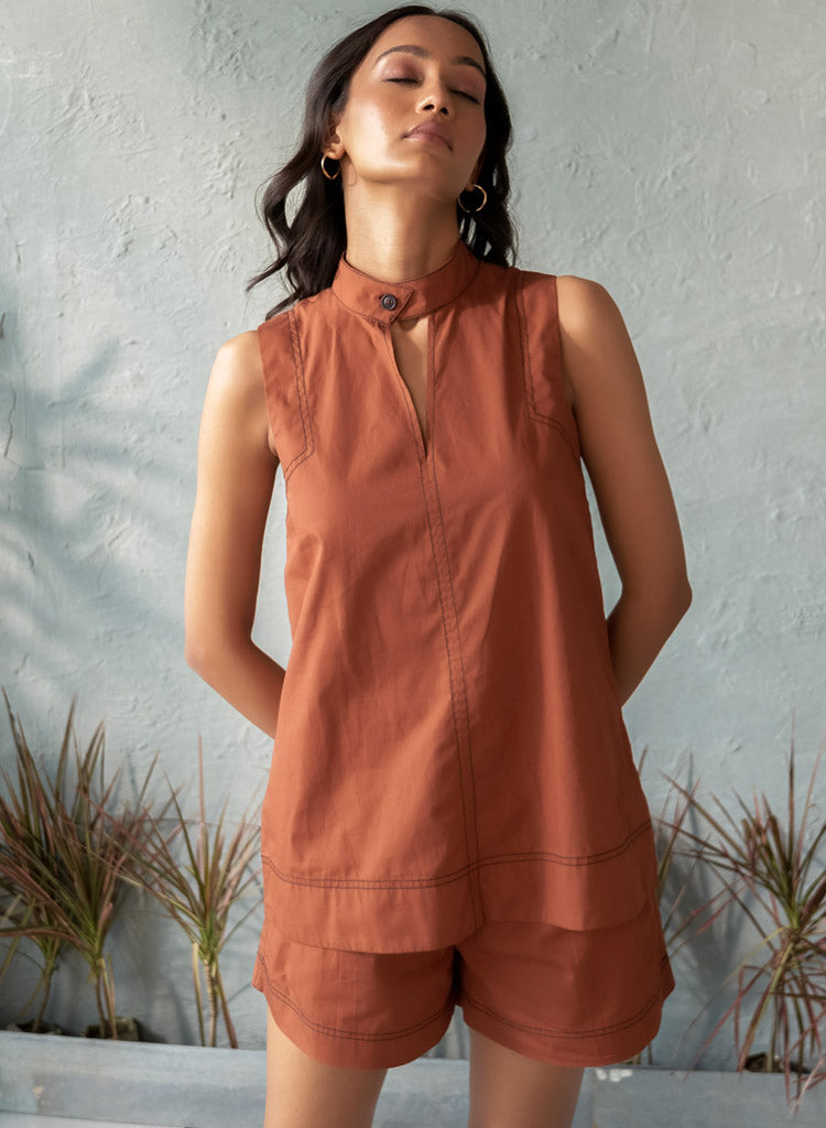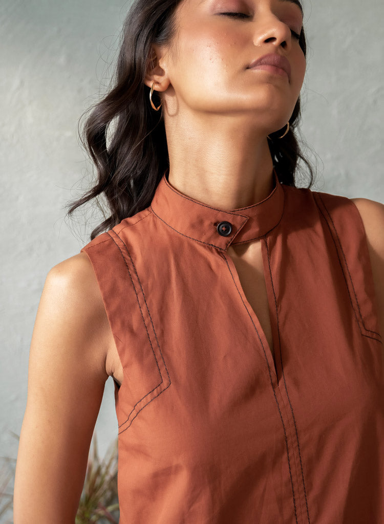 A chic top with intricate stitch detailing featuring a band collar with a button closure. Length 27". The model is 5'10" and is wearing size S.